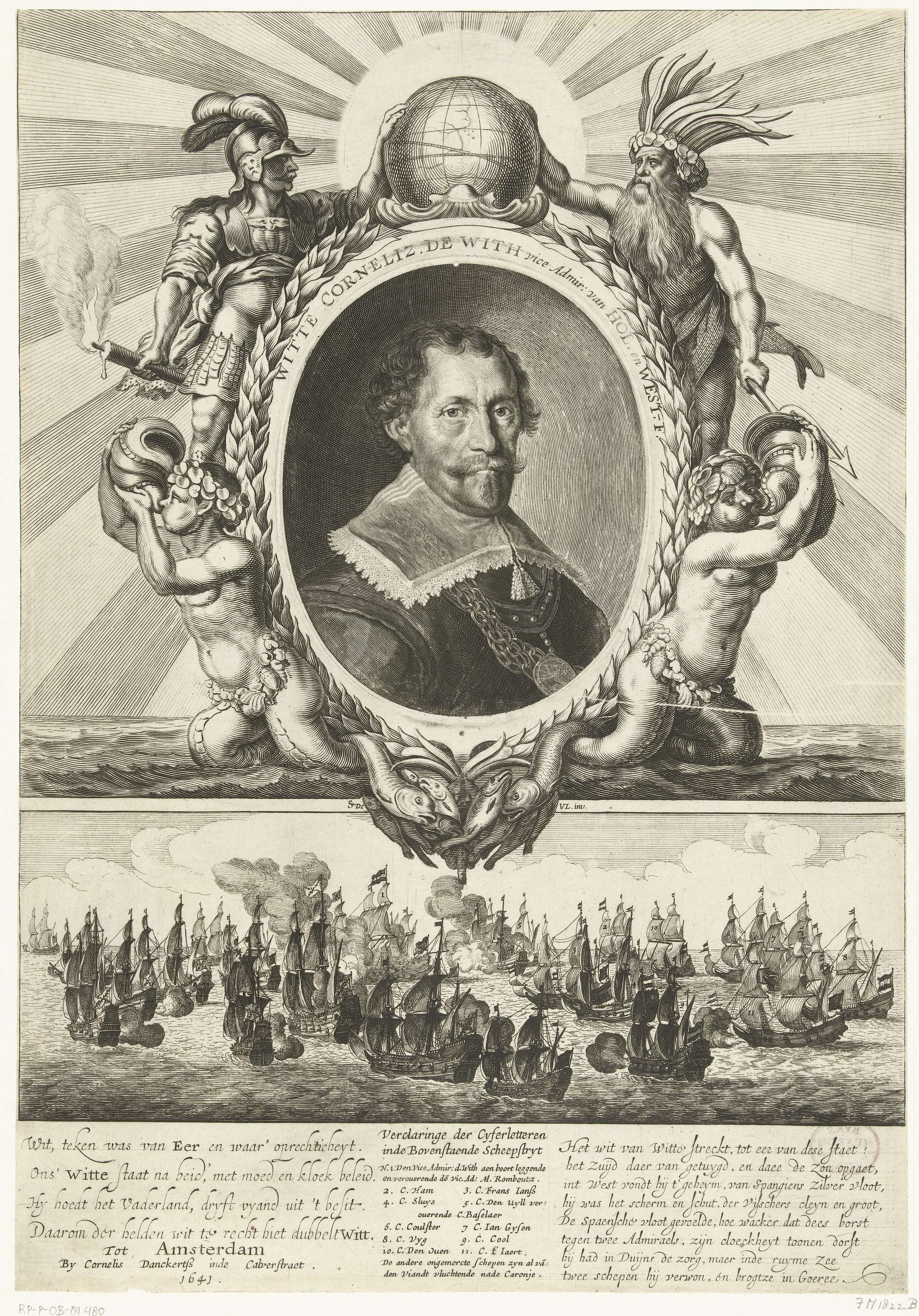 Allegorie op de overwinning van Witte de With op de Duinkerker vice-admiraal Rombouts, juli 1640. Centraal een plaat van een ovaal portret van Witte de With gedrukt binnen een omlijsting versierd met Mars, Pluto en tritonen. Onderaan een voorstelling van de zeeslag met twee verzen van elk 4 en 8 regels in het Nederlands. In ...