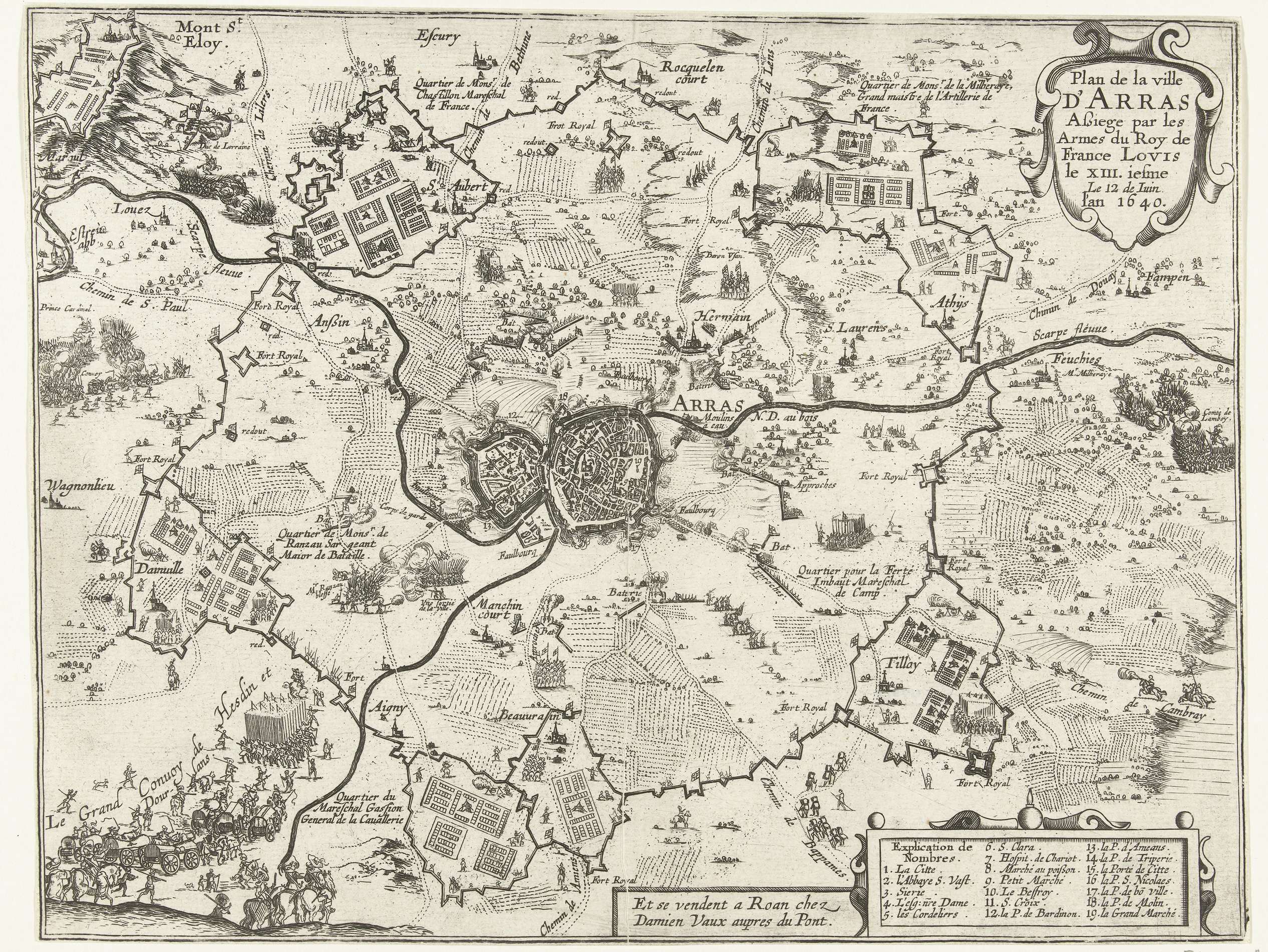 Kaart van het beleg van Arras (Atrecht) door de Fransen op Spanje, vanaf 12 of 13 juli 1640. Kaart met in het midden de stad, daaromheen de posities van de belegerende troepen. Rechtsonderaan de verklaring van de cijfers 1-19 in het Frans.