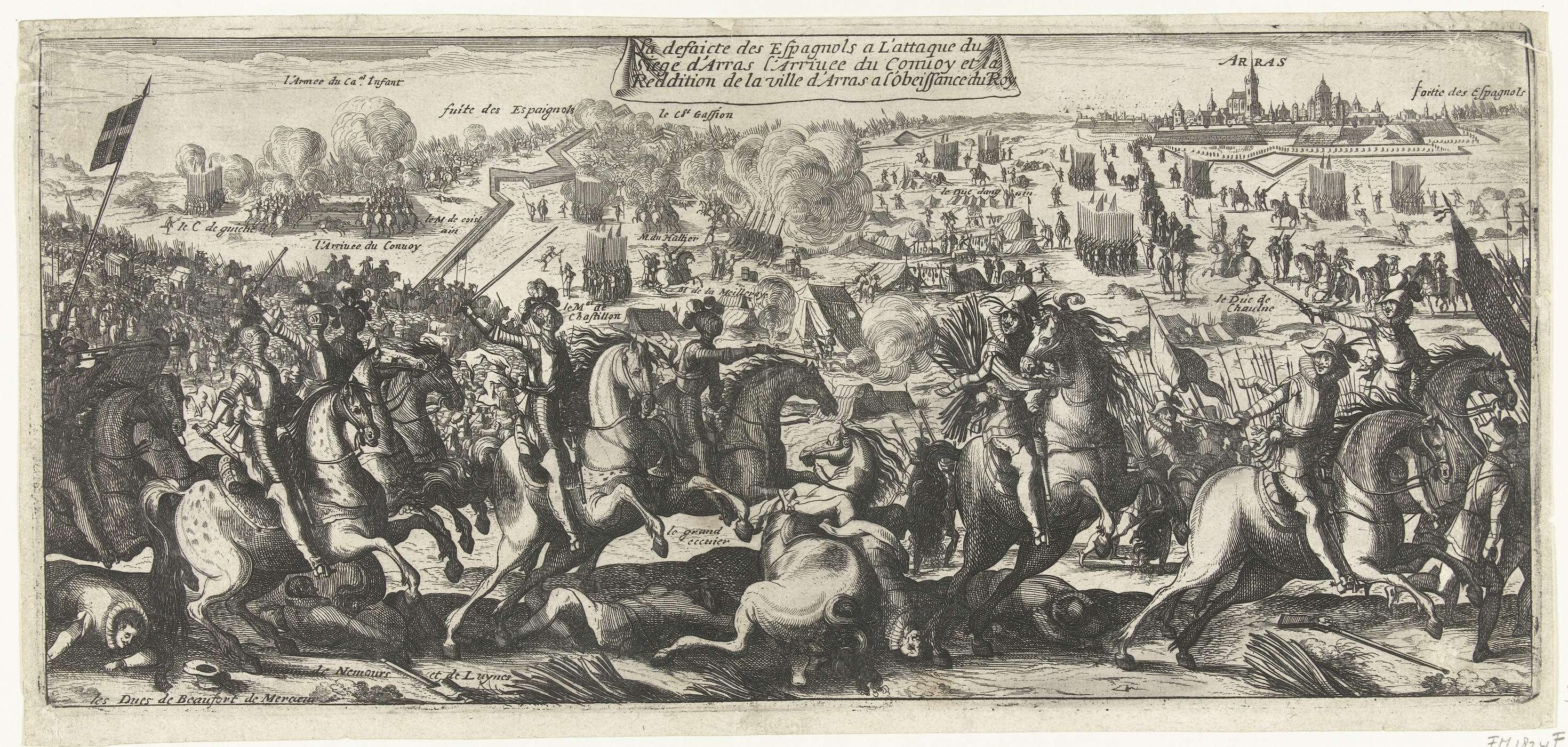 Franse ruiters verjagen de Spanjaarden, gevecht tijdens het beleg en de verovering van de stad Arras (Atrecht) door de Fransen op de Spanjaarden, 13 juli - 10 augustus 1640. Op de achtergrond links de aankomst van een konvooi of goederentransport, rechts de overgave van de stad en het vertrek van het Spaanse garnizoen.