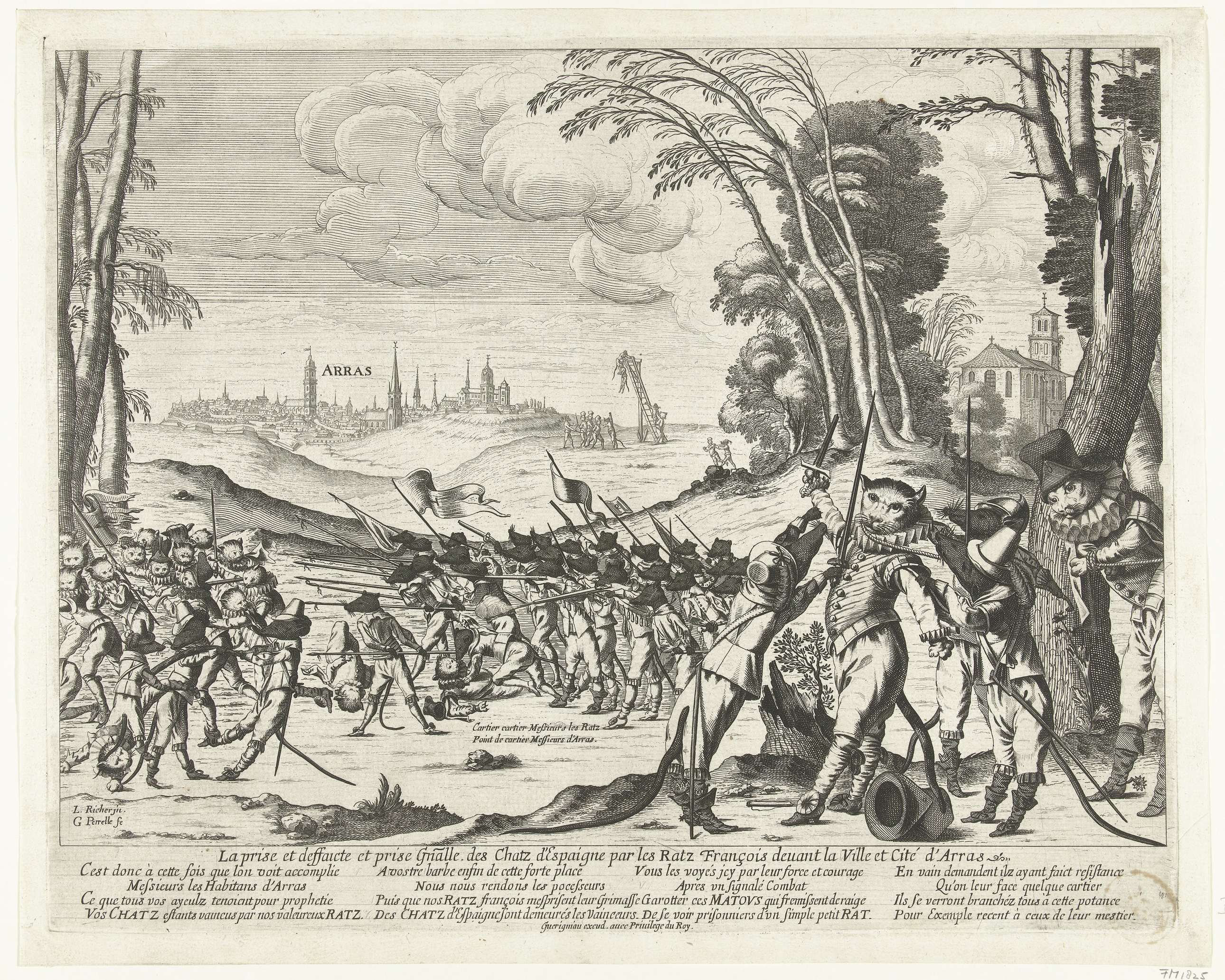 De verovering van Arras (Atrecht) door de Fransen op de Spanjaarden, 13 juli - 10 augustus 1640. De strijdende partijen verbeeld door dieren: de Spanjaarden als katten en de Fransen als ratten. Rechts wordt een gevangengenomen kat door de ratten ontwapend. Op de achtergrond het profiel van de stad en de ophanging aan een galg ...