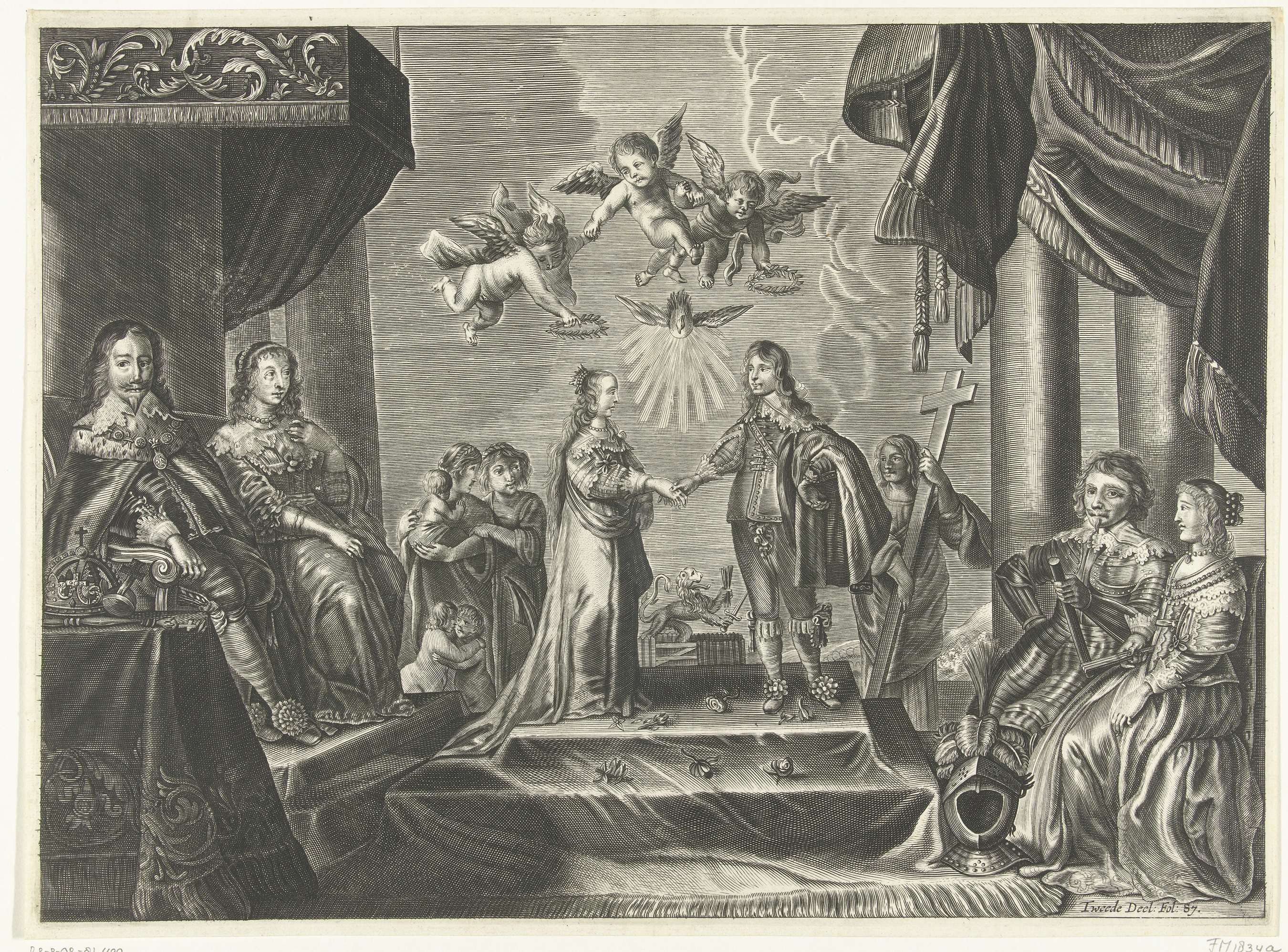 Het huwelijk van prins Willem II en prinses Maria Stuart, 2 mei 1641. Links de ouders van de bruid: de Engelse koning Karel I en zijn vrouw Henrietta Maria. Rechts de ouders van de bruidegom: Frederik Hendrik en Amalia van Solms. Op de achtergrond allegorische figuren van Liefde en Hoop (links) en Geloof (rechts) en ...