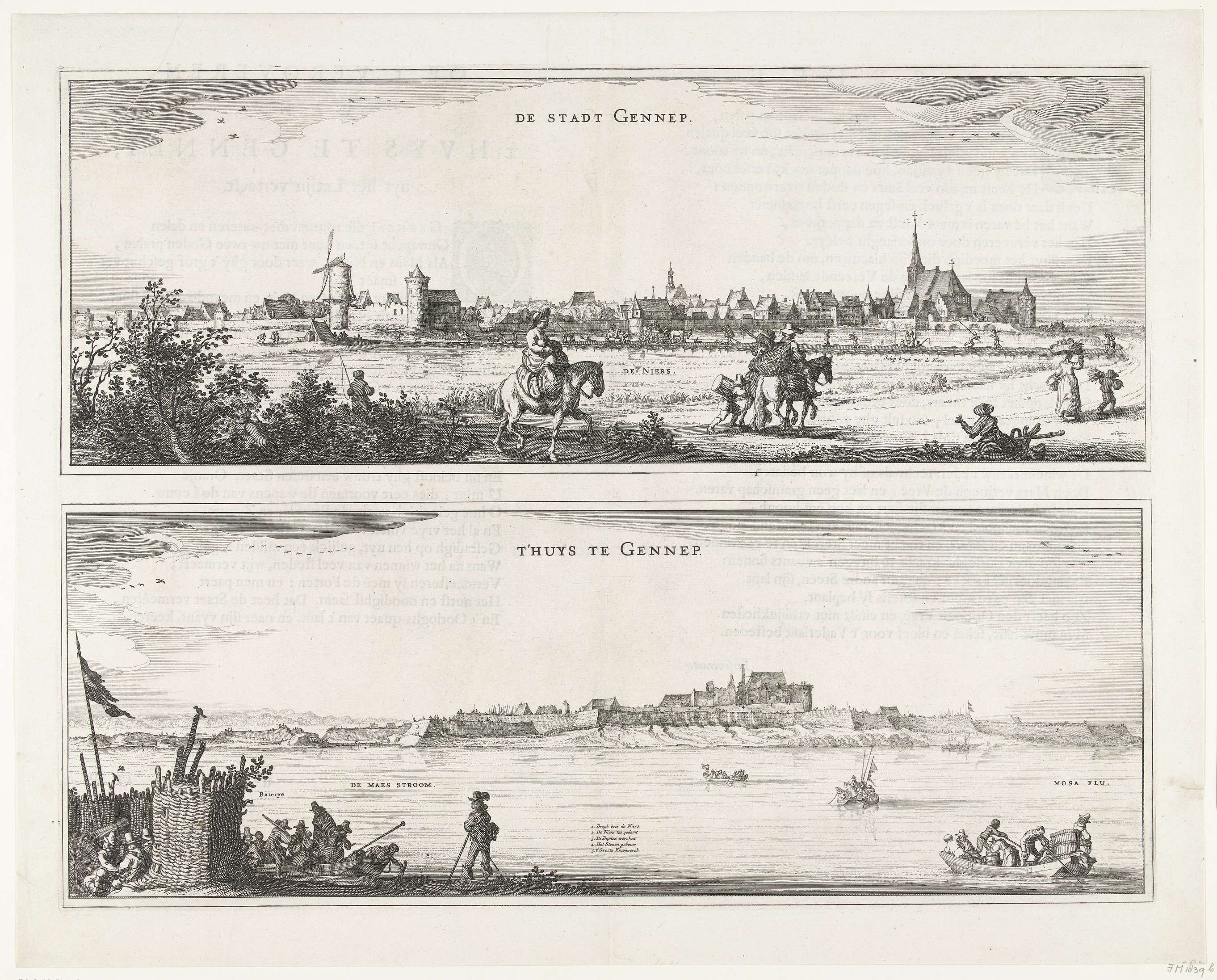 Beleg en verovering van Gennep en het Huis te Gennep door het Staatse leger onder Frederik Hendrik, 6 juni - 27 juli 1641. Onversneden blad met twee voorstellingen. Bovenaan een gezicht op de stad Gennep, op de voorgrond voorbijgangers op weg naar de stad over de schipbrug over de Niers. Onderaan een gezicht op het ...