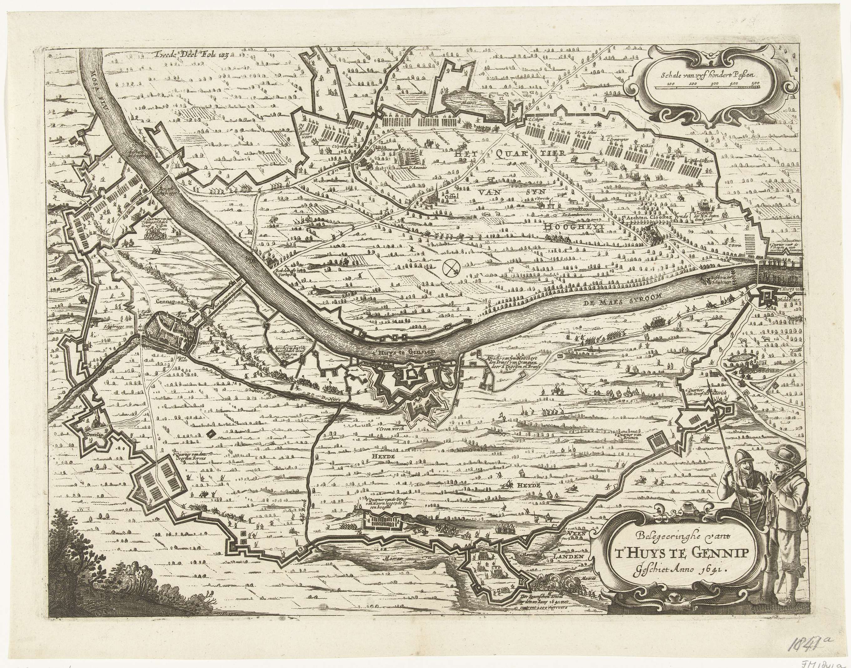 Kaart van Gennep met het Huis te Gennep en omgeving, belegerd en veroverd door het Staatse leger onder Frederik Hendrik, 6 juni - 27 juli 1641. Met de circumvallatielinie van de belegeraars en de hun legerkampen. Rechtsonderaan twee soldaten bij de cartouche met de titel. Linksboven gemerkt: Twede Deel Fol: 103.