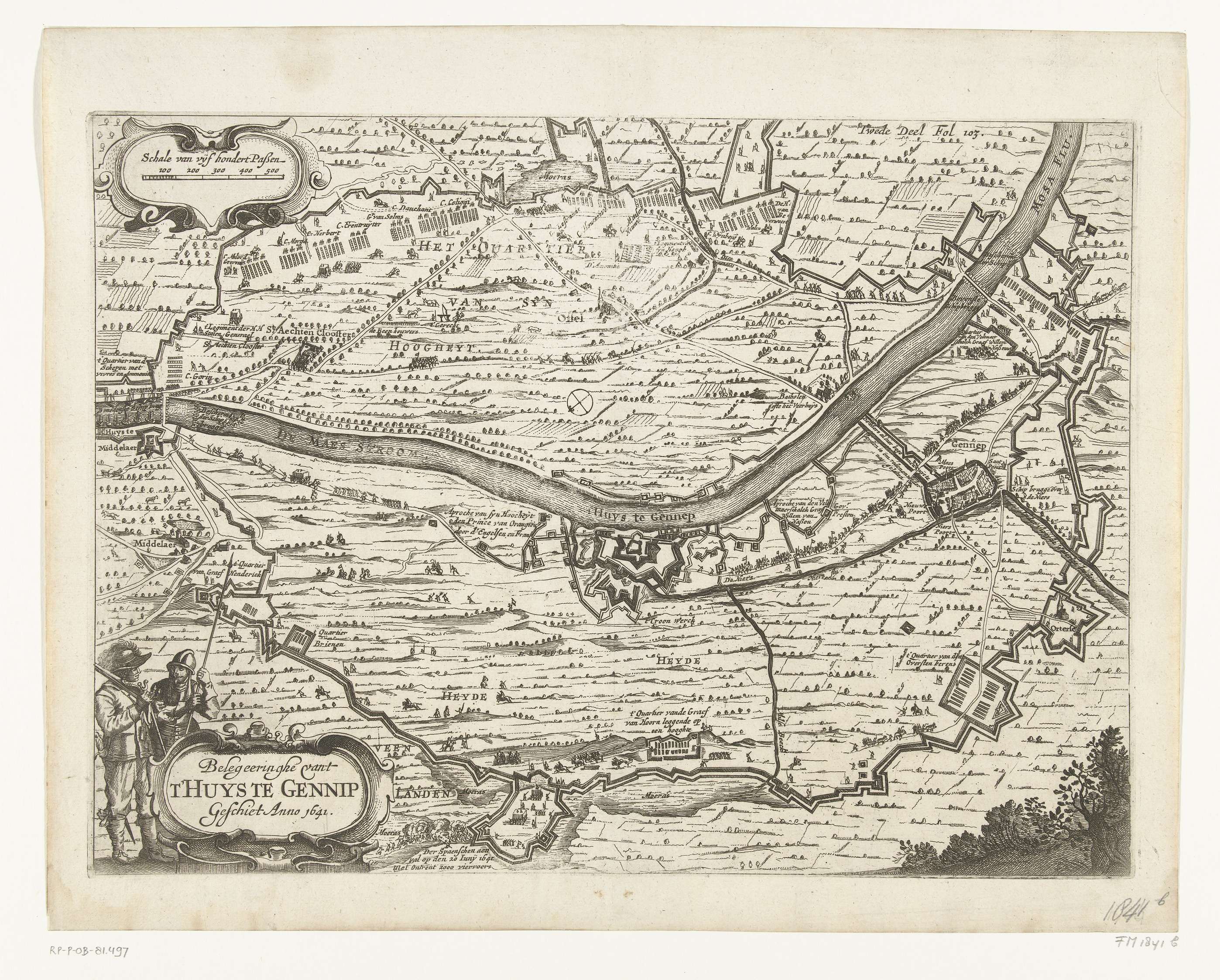 Kaart van Gennep met het Huis te Gennep en omgeving, belegerd en veroverd door het Staatse leger onder Frederik Hendrik, 6 juni - 27 juli 1641. Met de circumvallatielinie van de belegeraars en de hun legerkampen. Linksonderaan twee soldaten bij de cartouche met de titel. Rechtsboven gemerkt: Twede Deel Fol 103.