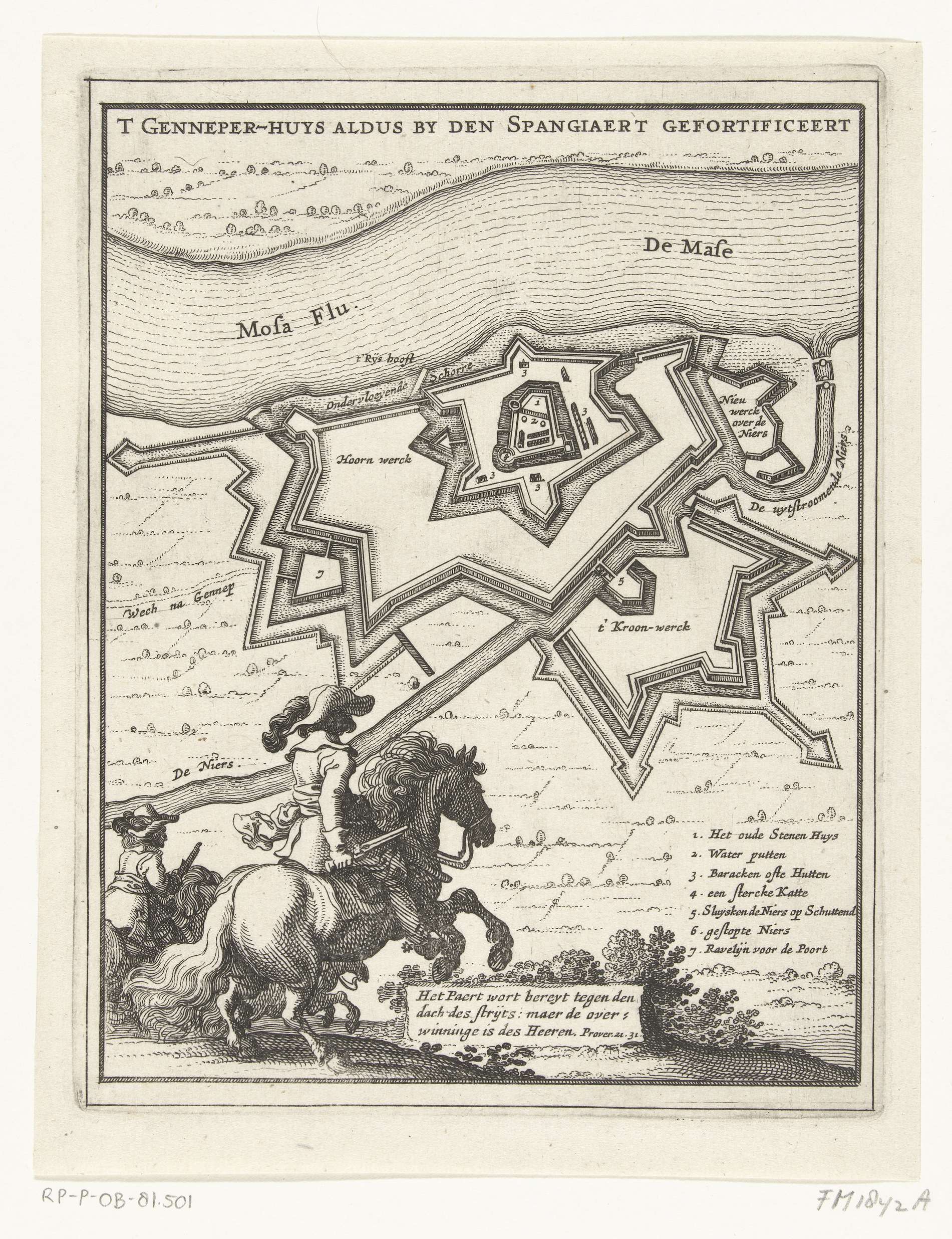 Plattegrond van het Huis te Gennep met de door de Spanjaarden aangelegde fortificaties, 1641. Het Huis te Gennep belegerd en veroverd door het Staatse leger onder Frederik Hendrik, 6 juni - 27 juli 1641. Op de voorgrond twee ruiters en een bijbelcitaat uit Spreuken, links de legenda 1-7. Onderdeel van een ensemble bestaande uit een ...