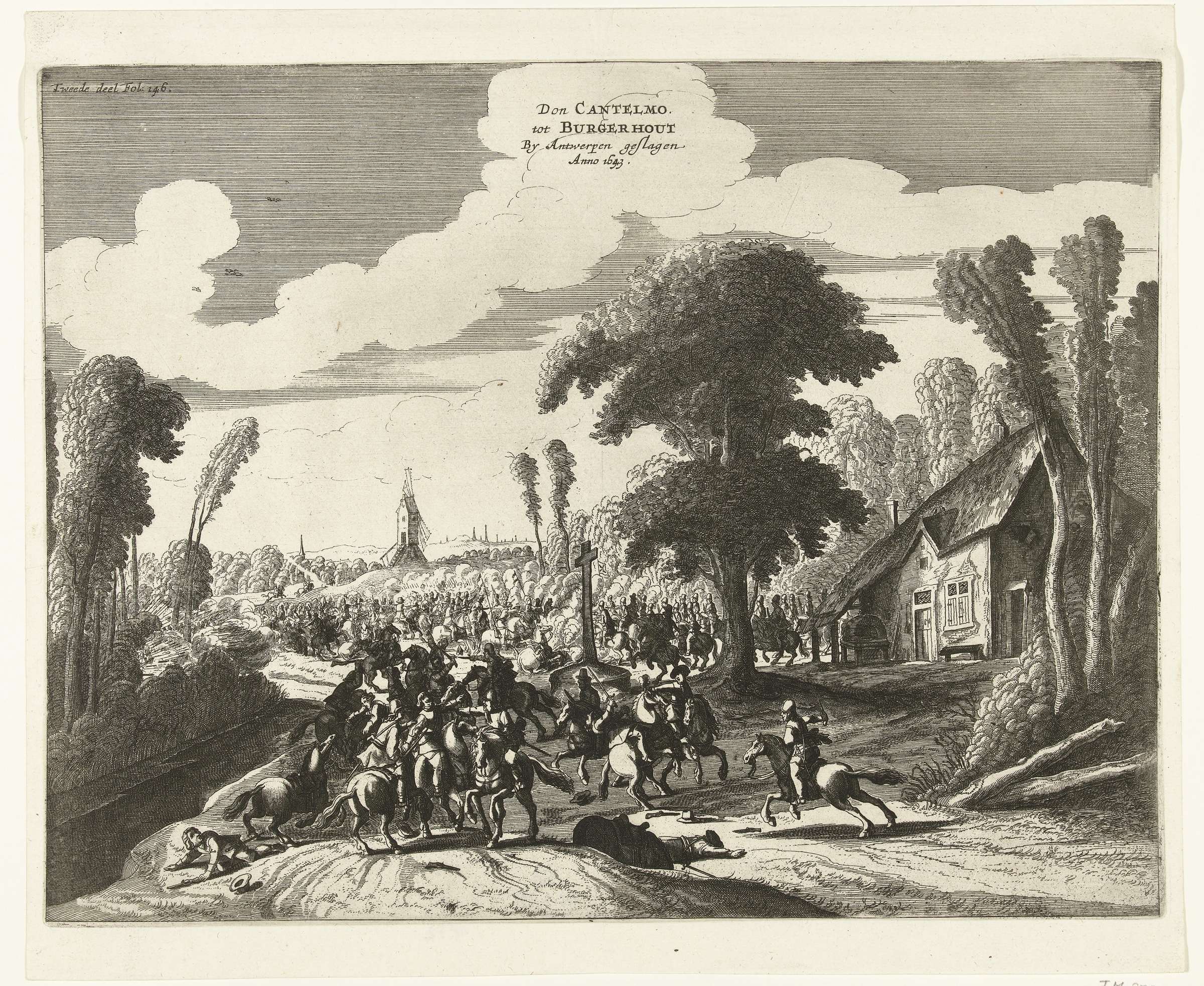 Gevecht bij Borgerhout in de buurt van Antwerpen waarbij een Spaans leger van Don Andrea Cantelmo onder bevel van Don Juan de Borges is verslagen door de Staatse troepen onder bevel van prins Willem II, 4 september 1643. Ruitergevecht in het dorp. Gemerkt linksboven: Tweede deel Fol: 146.