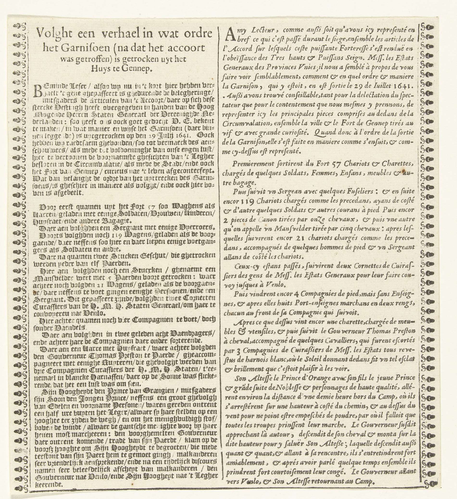 Vertrek van het Spaanse garnizoen uit Huis te Gennep op 29 juli 1641, na het beleg en de verovering van het Huis te Gennep door het Staatse leger onder Frederik Hendrik, 6 juni - 27 juli 1641. Derde tekstblad bij de grote voorstelling van de uittocht van de Spaanse troepen in 4 bladen. Tekst in ...
