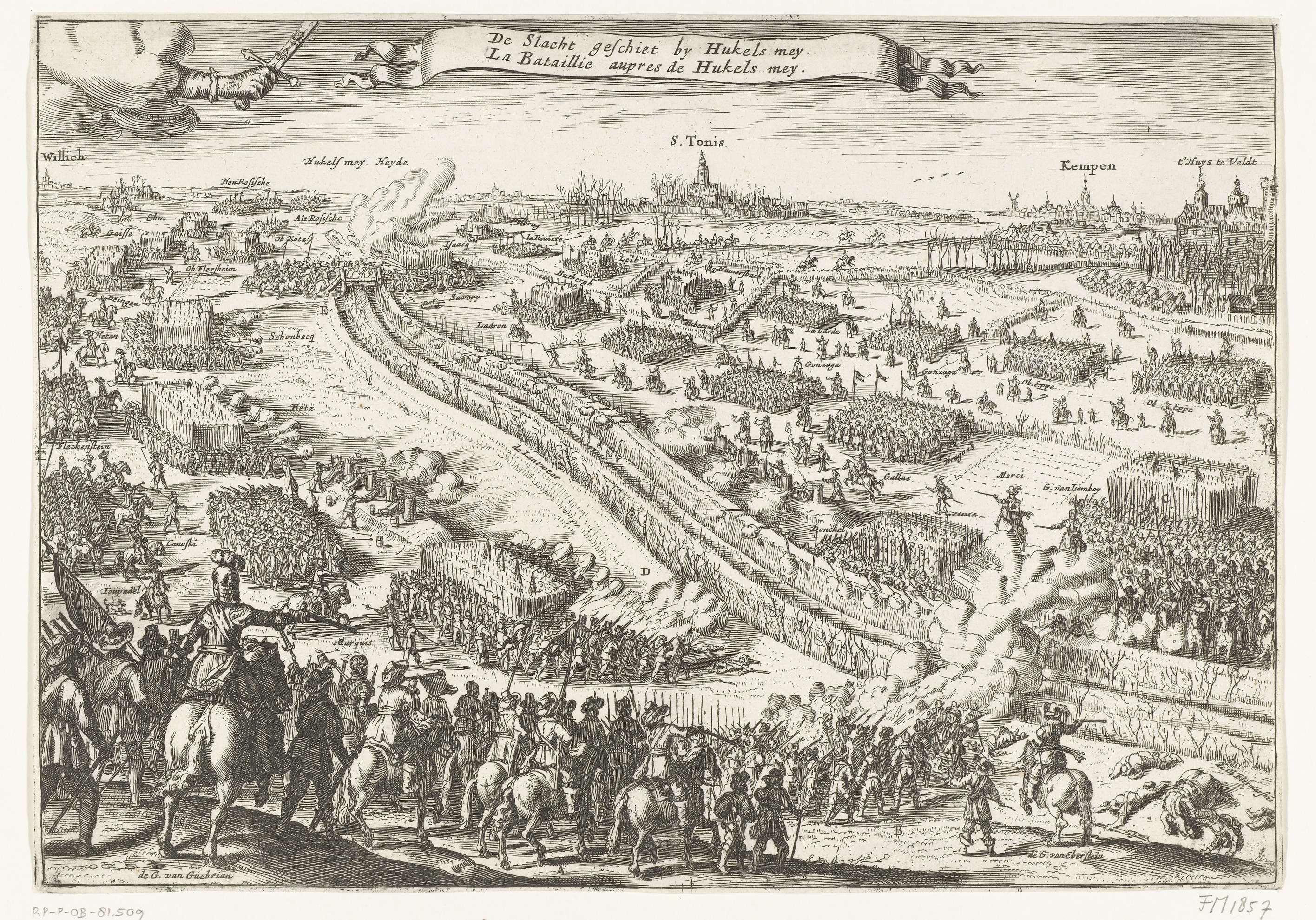 De veldslag bij Hickelsmey (bij Kempen), 17 januari 1642. Slag waarbij de Weimarse en Franse troepen onder Jean Baptiste Budes de Guébriant de overwinning behaalde over de keizerlijke Hessische troepen onder Guillaume de Lamboy. De veldslag vond plaats in Duitsland nabij Krefeld, Willich, Kempen en Tönisvorst (St. Tönis). Linksboven de hand van God met zwaard ...