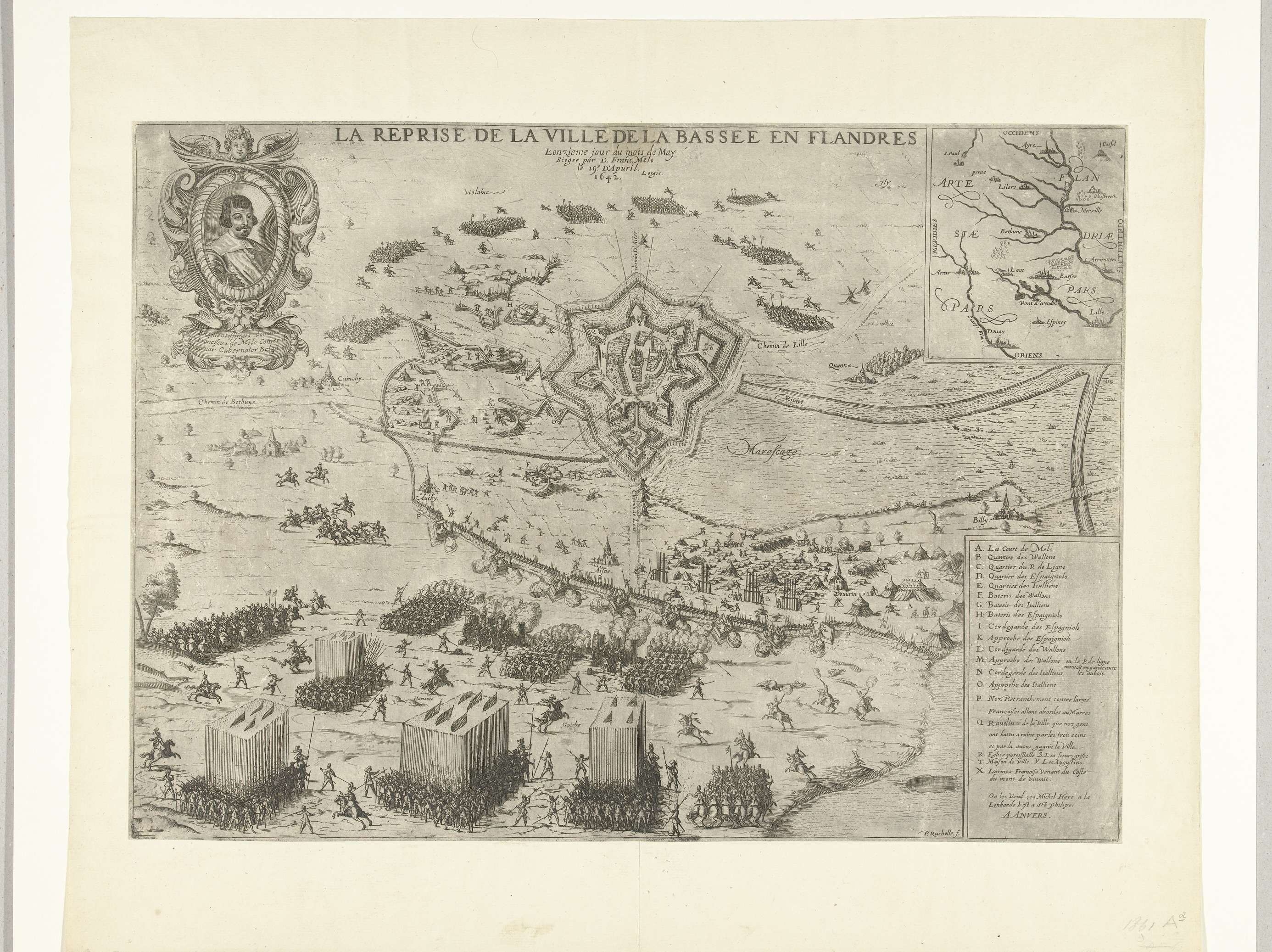 Kaart met de herovering van de vestingstad La Bassée door het Spaanse leger onder landvoogd Francisco de Melo op 11 mei na een belegering begonnen op 19 april 1642. Centraal de versterkte stad, op de voorgrond de belegerende troepen. Linksboven een portret van De Melo, rechtsboven een inzet met een kaartje van het groter gebied. ...