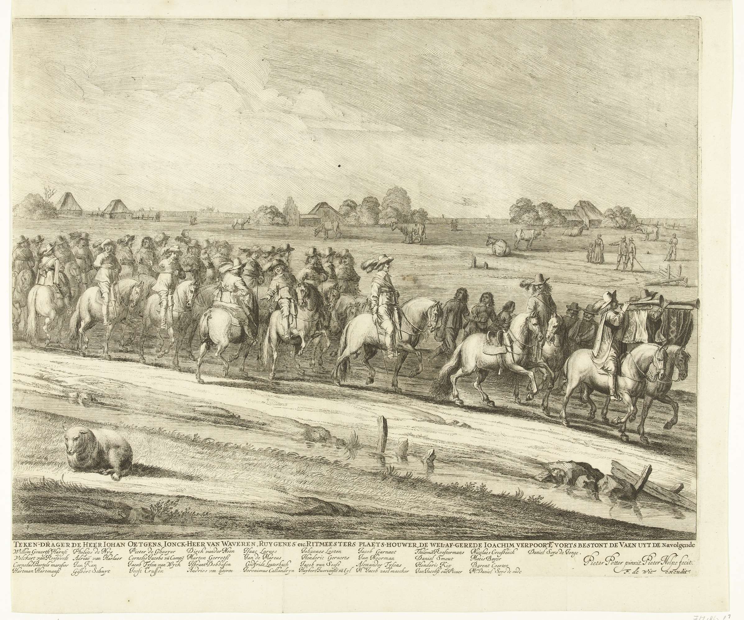 Optocht van de schutters langs de Haarlemmertrekvaart bij de intocht van Engelse koningin Henrietta Maria te Amsterdam, 20 mei 1642. Geheel bestaande uit drie bladen: rechterblad. Het begin van de stoet voorafgegaan door trompetters. In het onderschrift een lijst in 10 kolommen met een deel van de namen van de ruiters in de stoet.