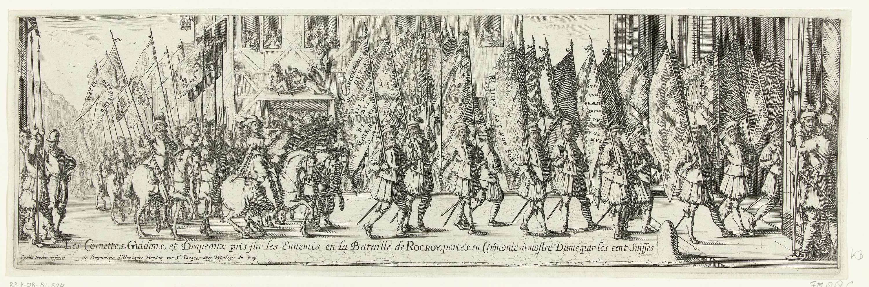 Optocht met de tijdens de slag bij Rocroi (19 mei 1643) op de Spanjaarden buitgemaakte vaandels en vlaggen, gedragen door honderd Zwitserse soldaten naar de kerk Notre-Dame, 1643. Stoet met soldaten te voet en te paard.