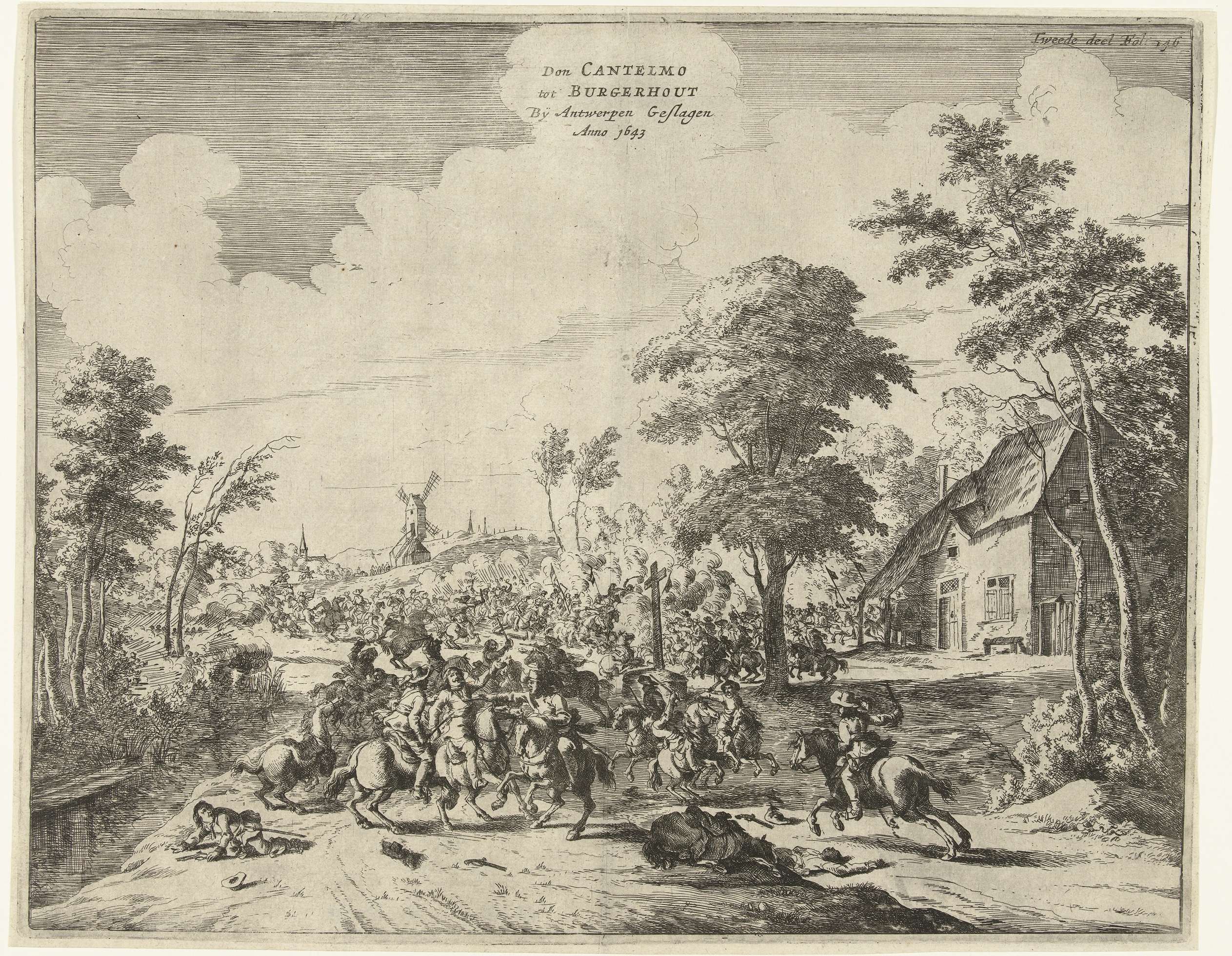 Gevecht bij Borgerhout in de buurt van Antwerpen waarbij een Spaans leger van Don Andrea Cantelmo onder bevel van Don Juan de Borges is verslagen door de Staatse troepen onder bevel van prins Willem II, 4 september 1643. Ruitergevecht in het dorp. Gemerkt rechtsboven: Tweede deel Fol: 146.