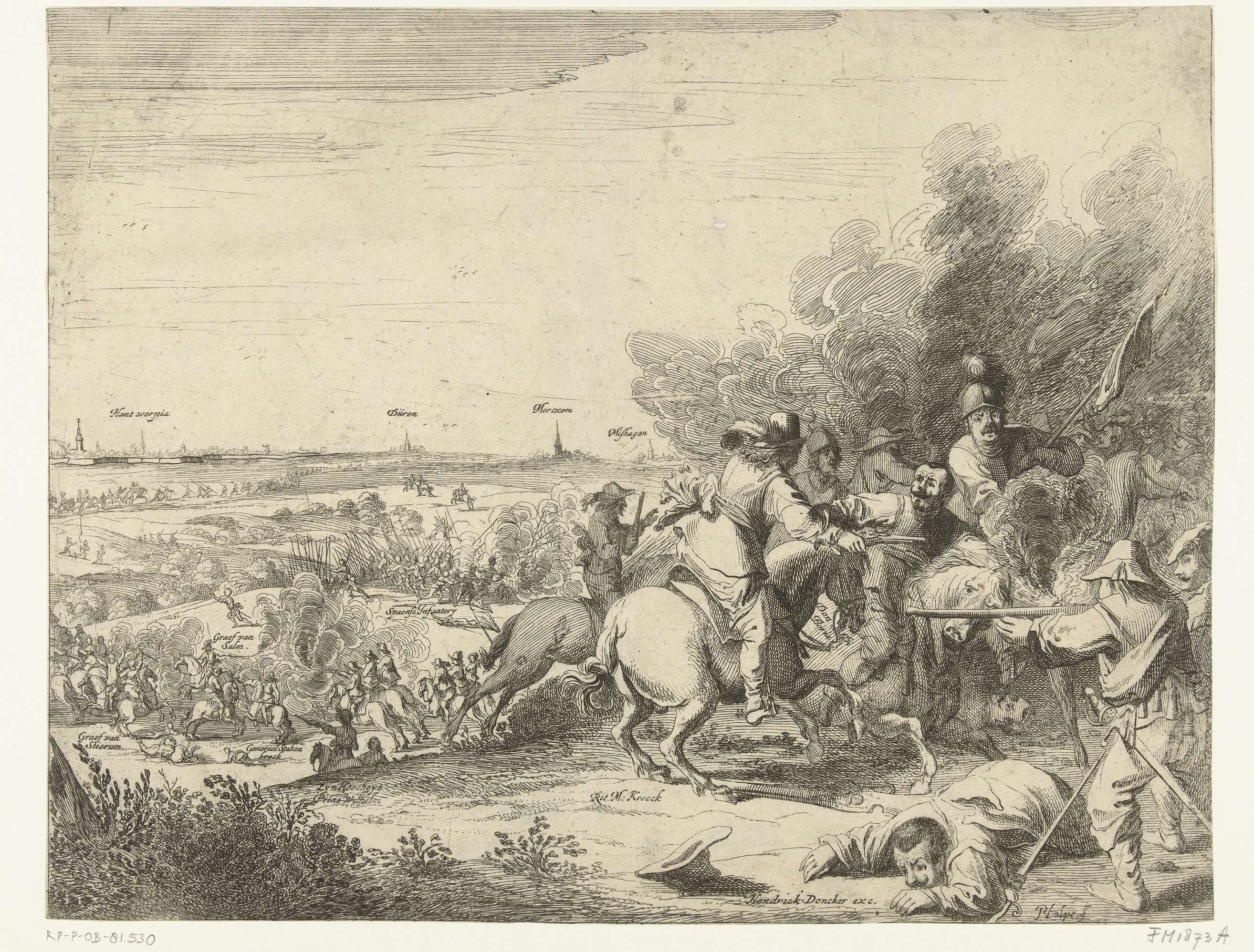 Gevecht bij Borgerhout in de buurt van Antwerpen waarbij een Spaans leger van Don Andrea Cantelmo onder bevel van Don Juan de Borges is verslagen door de Staatse troepen onder bevel van prins Willem II, 4 september 1643. Centraal het woeste ruitergevecht tussen ritmeester Kroock en De Borges (Don di Boria), meer naar achteren overziet ...
