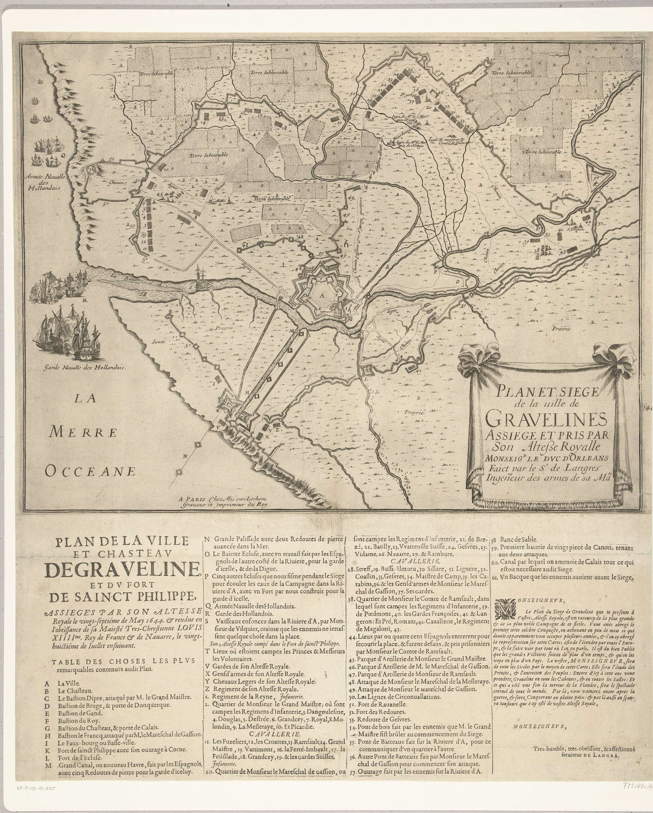 Kaart van het beleg en de verovering van de stad Grevelingen door het Franse leger onder Gaston hertog van Orléans, 27 mei - 28 juli 1644. Plan van de versterkte stad met het omliggende land, links de haven geblokkeerd door Hollandse schepen. Onder de prent is een tekstblad geplakt met de legenda A-Z en 1-61 ...