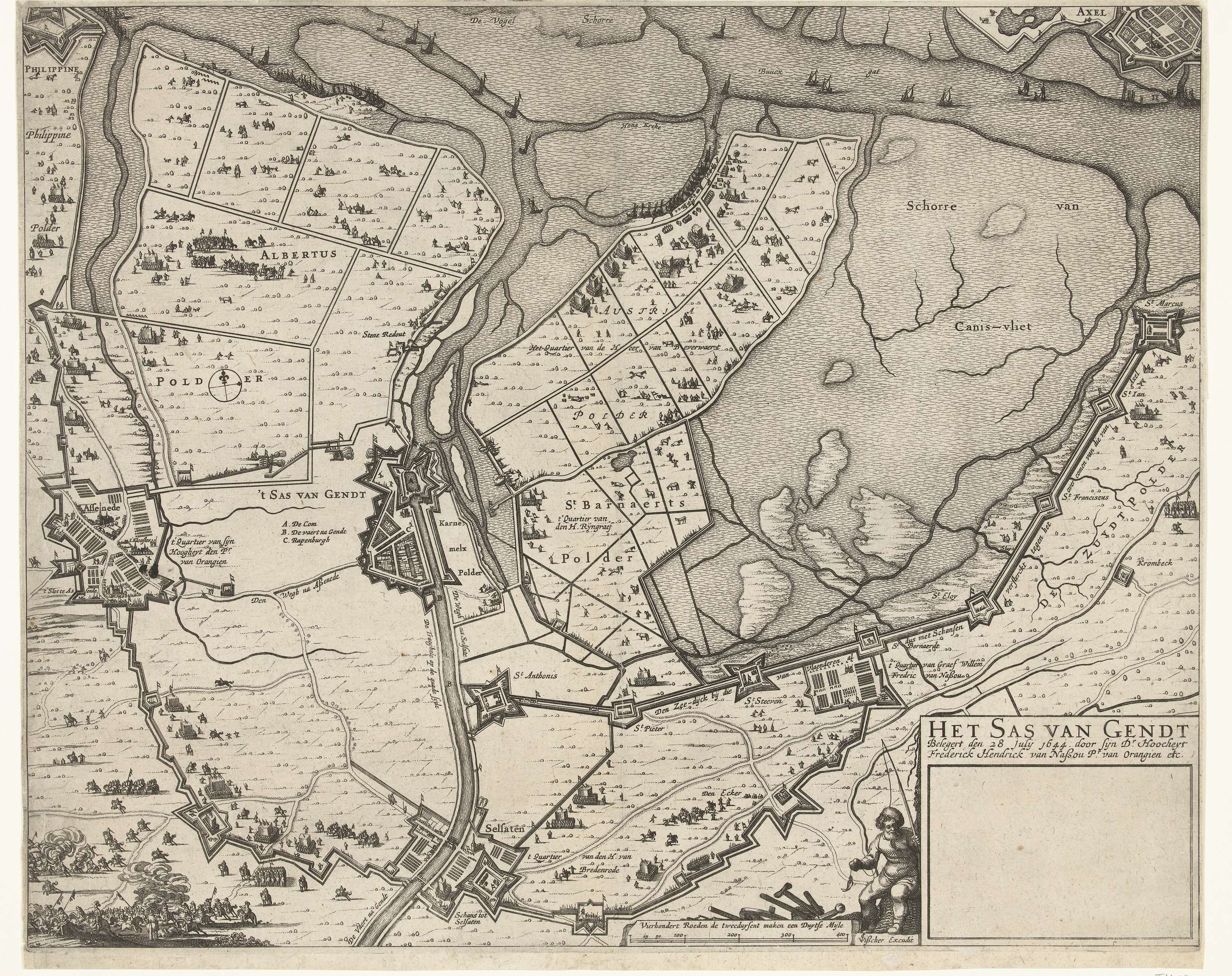Kaart van het beleg van de stad Sas-van Gent door het Staatse leger onder Frederik Hendrik, begonnen 28 juli 1644. Kaart van Sas-van-Gent en het omliggende land tussen Philippine, Axel en Zelzate met de dijken en schansen aangelegd door de belegeraars en hun legerkampen. Rechtsonder een cartouche met de titel, verder leeg. Bij de prent ...