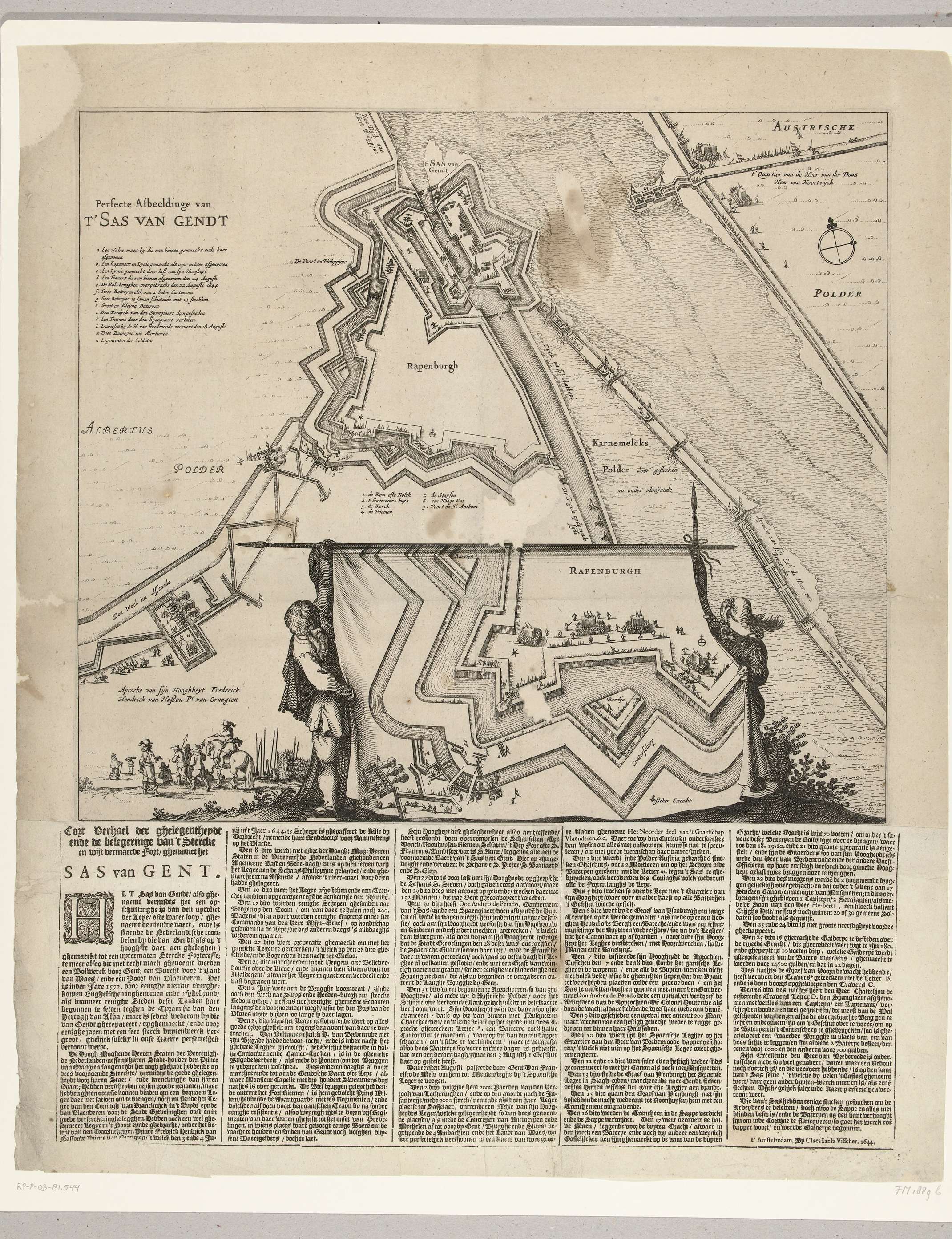 Plattegrond van Sas van Gent, belegerd door het Staatse leger onder Frederik Hendrik, begonnen 28 juli en ingenomen op 5 september 1644. Plattegrond van de versterkingen rond Sas-van-Gent, onderaan twee mannen met een doek waarop een uitvergroot detail van de beschietingen bij de ravelijnen bij het Rapenburg. Linksboven de titel en de legenda a-n. Onder ...