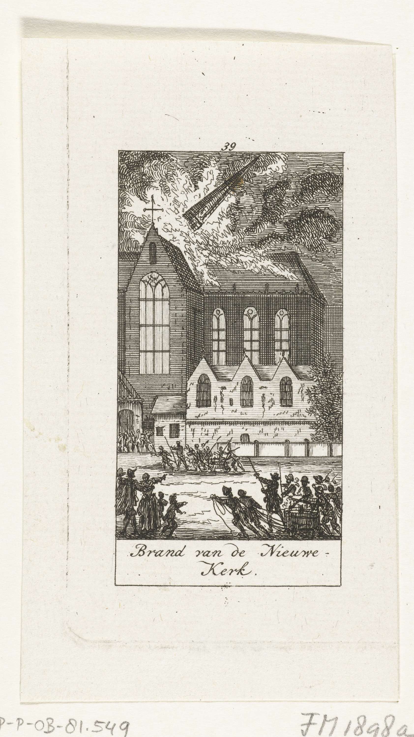 Brand in de Nieuwe Kerk te Amsterdam, 11 januari 1645. De spits valt om, op de voorgrond komt de brandweer aangesneld.
