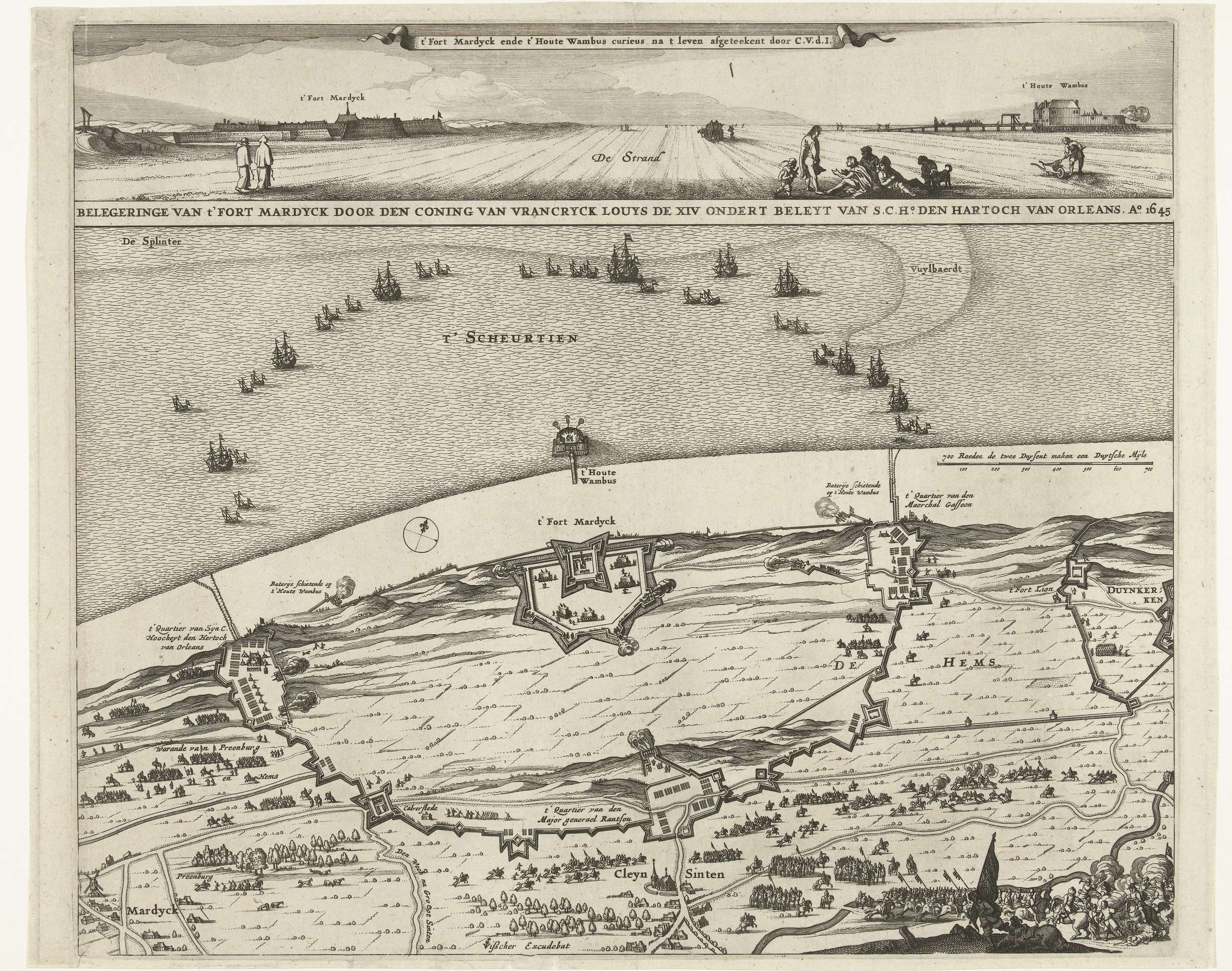 Beleg en verovering van het fort Mardijk bij het plaatsje Mardijk bij Duinkerken, 22 juni - 9 juli 1645, door het Franse leger onder Gaston, hertog van Orleans op de Spanjaarden. Bovenaan een profiel van het fort Mardijk aan het strand met de schans het Houten Wambus, daaronder een plan van het fort en het ...