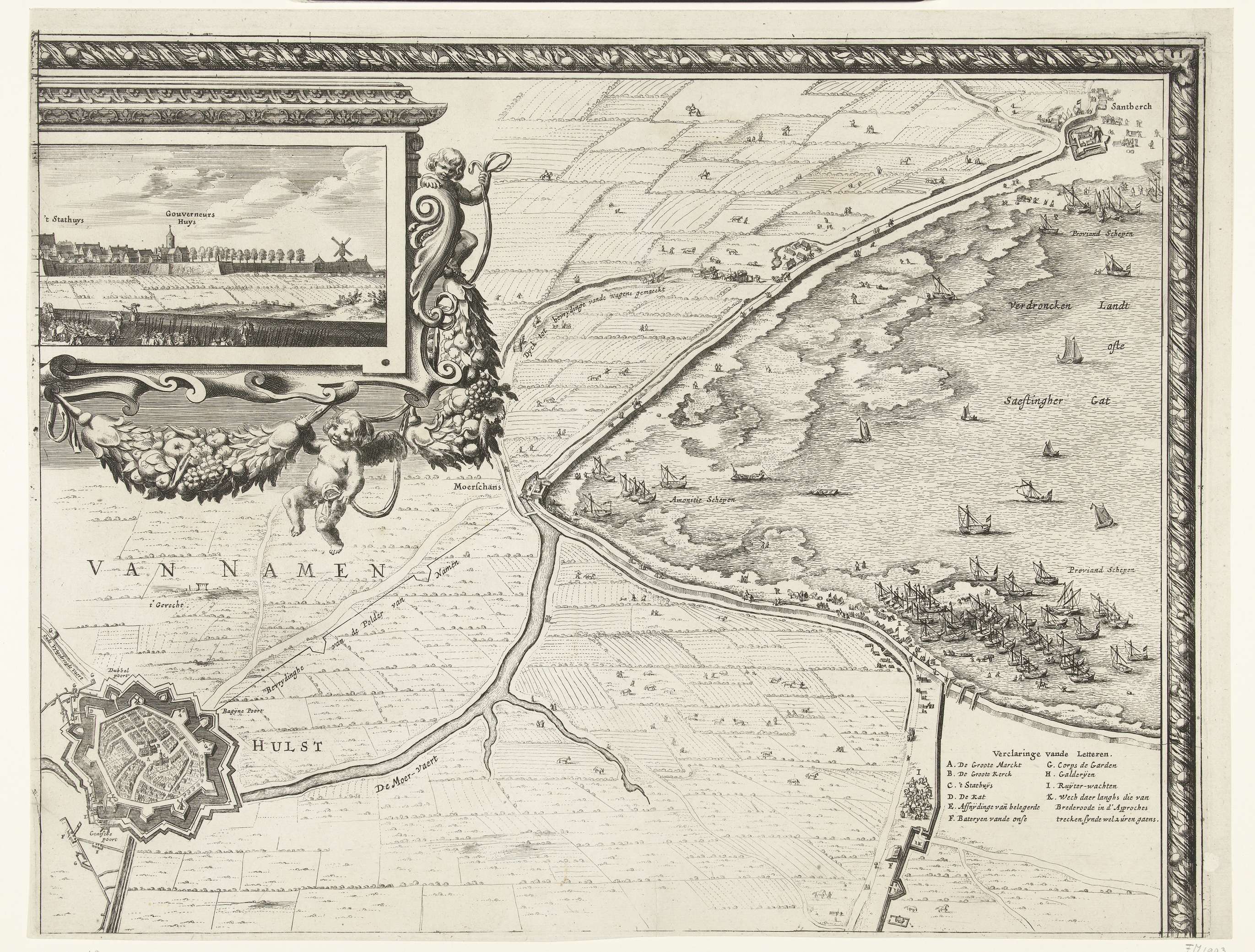Beleg en verovering van Hulst door het Staatse leger onder Frederik Hendrik van 28 september tot 5 november 1645. Blad rechtsboven in de grote kaart. Links de stad Hulst, met de rechterhelft van een profiel van de stad. Rechts proviandschepen op het Verdronken Land van Saeftinghe en de legenda A-K. Onderdeel van een ongemonteerd ensemble ...