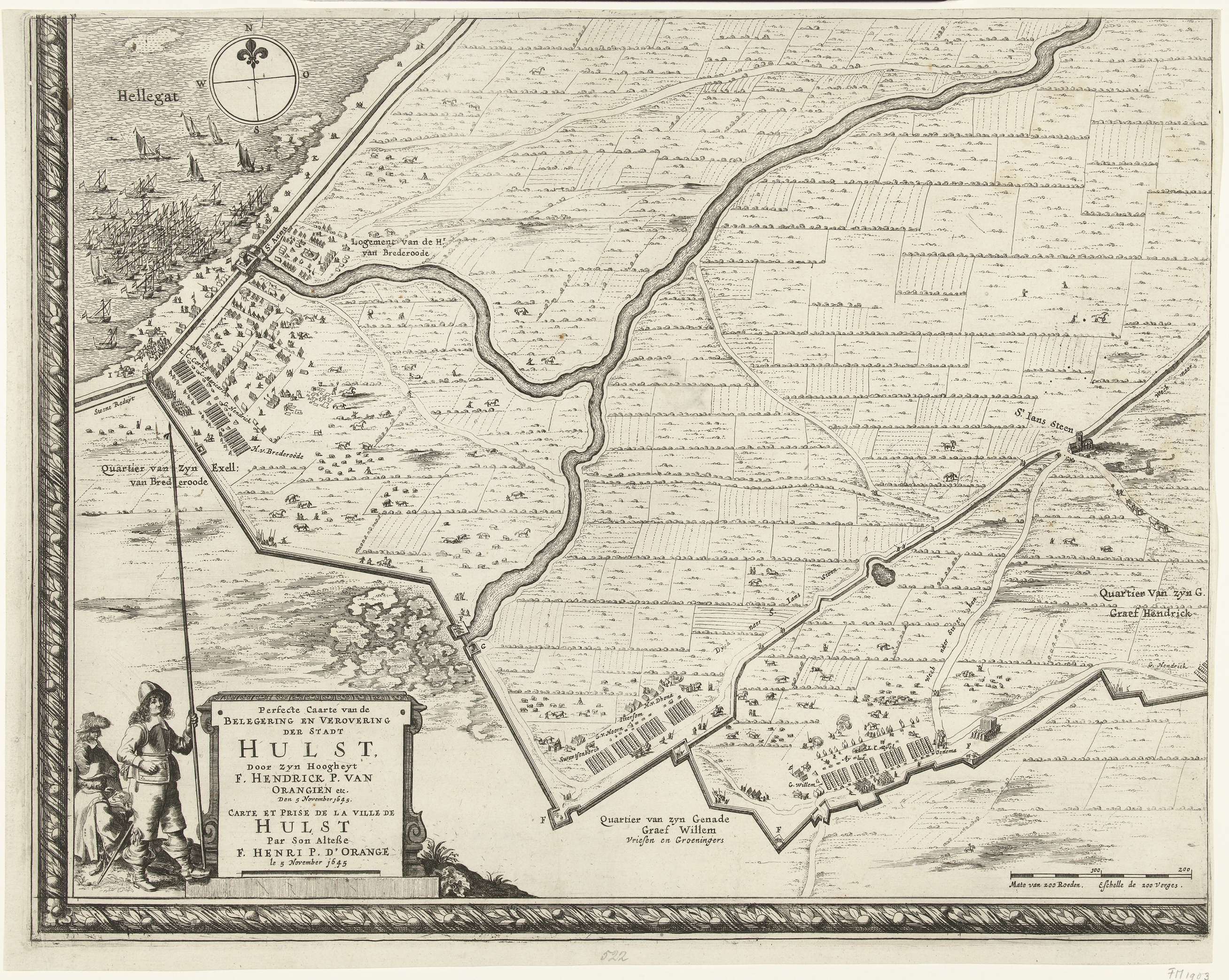 Beleg en verovering van Hulst door het Staatse leger onder Frederik Hendrik van 28 september tot 5 november 1645. Blad linksonder in de grote kaart. Kaart met belegeringswerken en de legerkampen van de belegeraars. Linksonder een cartouche met de titel en enkele soldaten. Onderdeel van een ongemonteerd ensemble bestaande uit de grote kaart van het ...