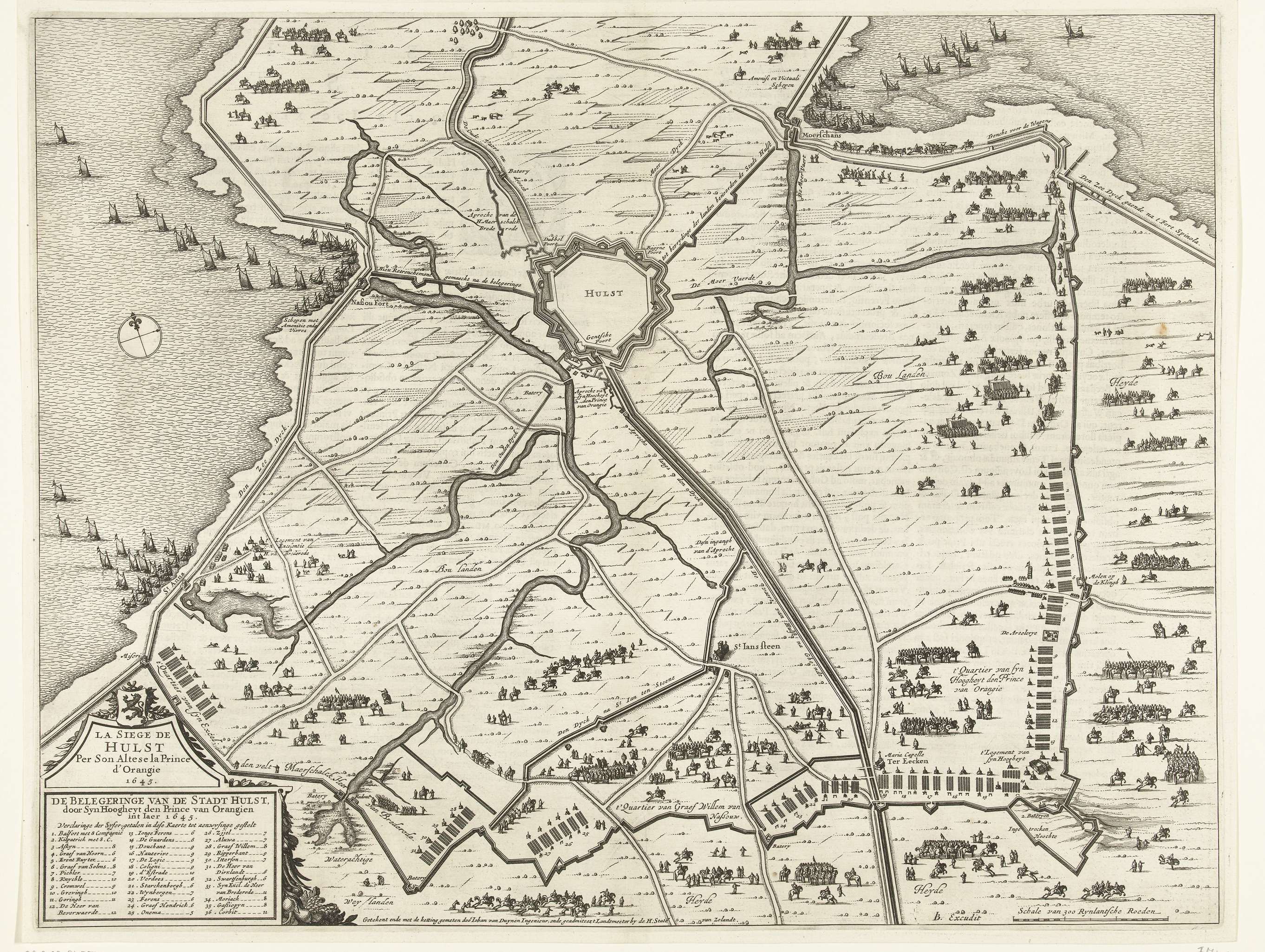 Beleg en verovering van Hulst door het Staatse leger onder Frederik Hendrik van 28 september tot 5 november 1645. Plan van de stad Hulst en het omliggende land met de omsingeling en de legerkampen van de belegeraars. Linksonder een cartouche met de legenda 1-26. Rechtsonder een schaalstok: Schale van 300 Rynlantsche Roeden. Op verso Latijnse ...