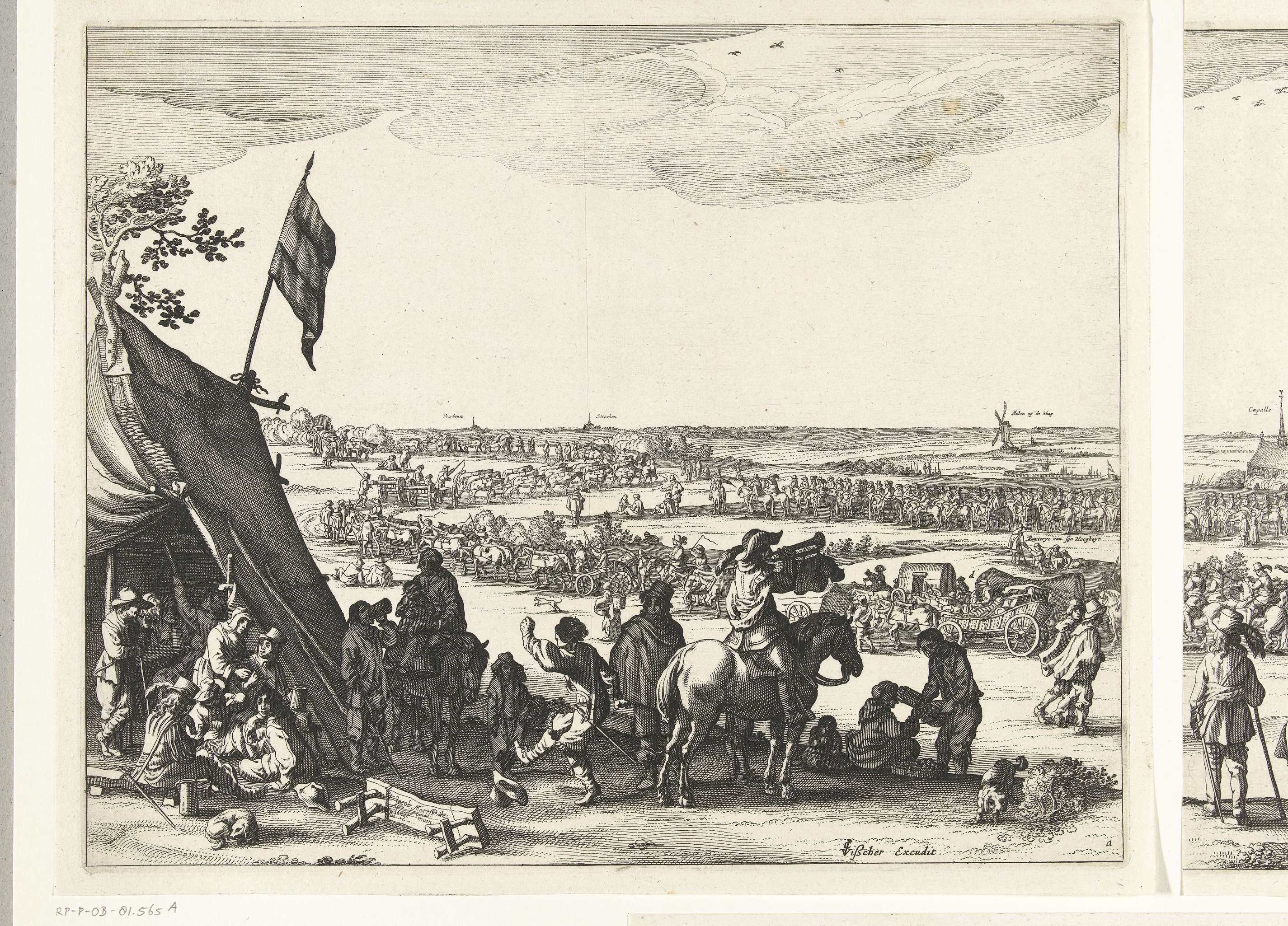 Uittocht van het Spaanse garnizoen uit Hulst (blad a), 1645. Hulst, belegerd door het Staatse leger onder Frederik Hendrik vanaf 28 september en ingenomen op 5 november 1645. Linkerblad in een voorstelling bestaande uit drie bladen. Op de voorgrond een tent met drinkende, kaartende en dansende Staatse soldaten en een trompetter. Op de achtergrond de ...