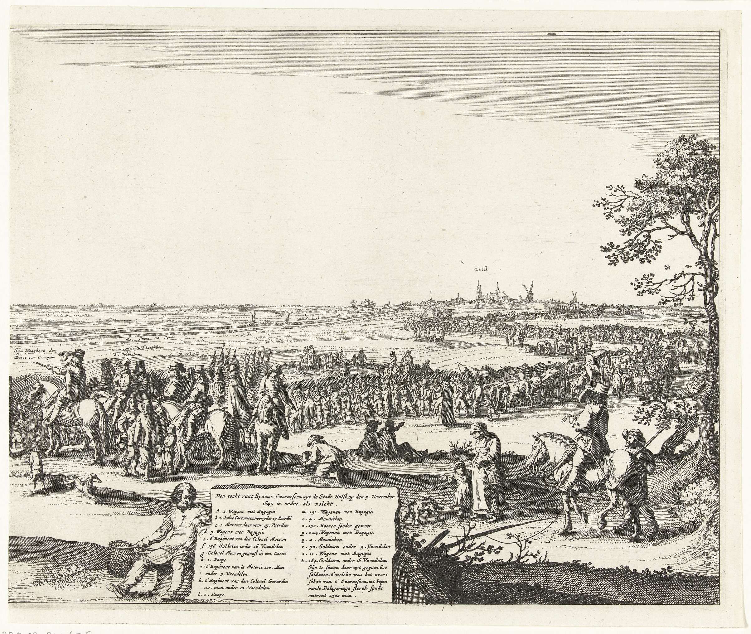 Uittocht van het Spaanse garnizoen uit Hulst (blad c), 1645. Hulst, belegerd door het Staatse leger onder Frederik Hendrik vanaf 28 september en ingenomen op 5 november 1645. Rechterblad in een voorstelling bestaande uit drie bladen. Stadhouder Frederik Hendrik met prins Willem II te paard overziet het uitmarcheren van het Spaanse leger. Deel van de ...