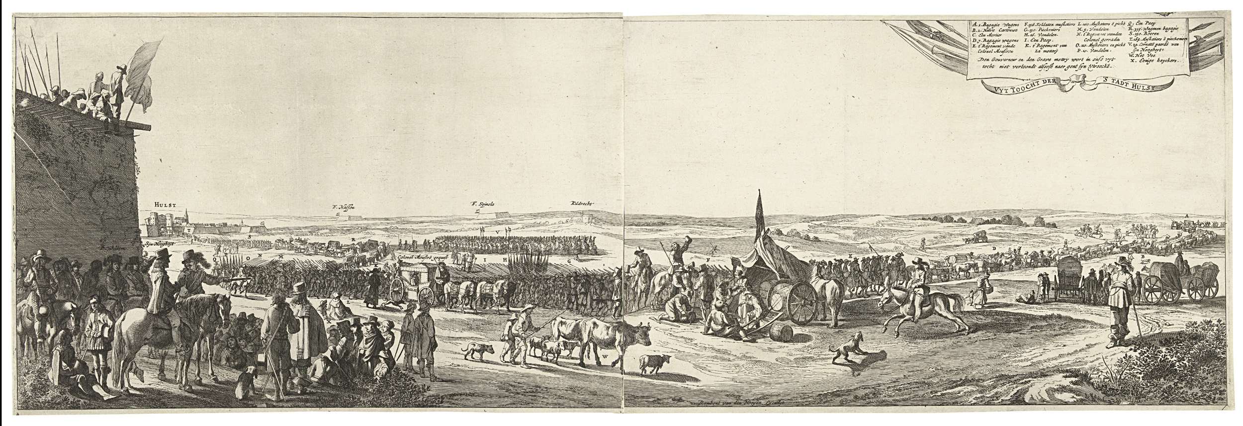 Uittocht van het Spaanse garnizoen uit Hulst, 1645. Hulst, belegerd door het Staatse leger onder Frederik Hendrik vanaf 28 september en ingenomen op 5 november 1645. Voorstelling bestaande uit twee bladen. Op de voorgrond links bij de stadswal Frederik Hendrik met zijn zoon prins Willem II die toezien op de vertrekkende soldaten. In de stoet ...