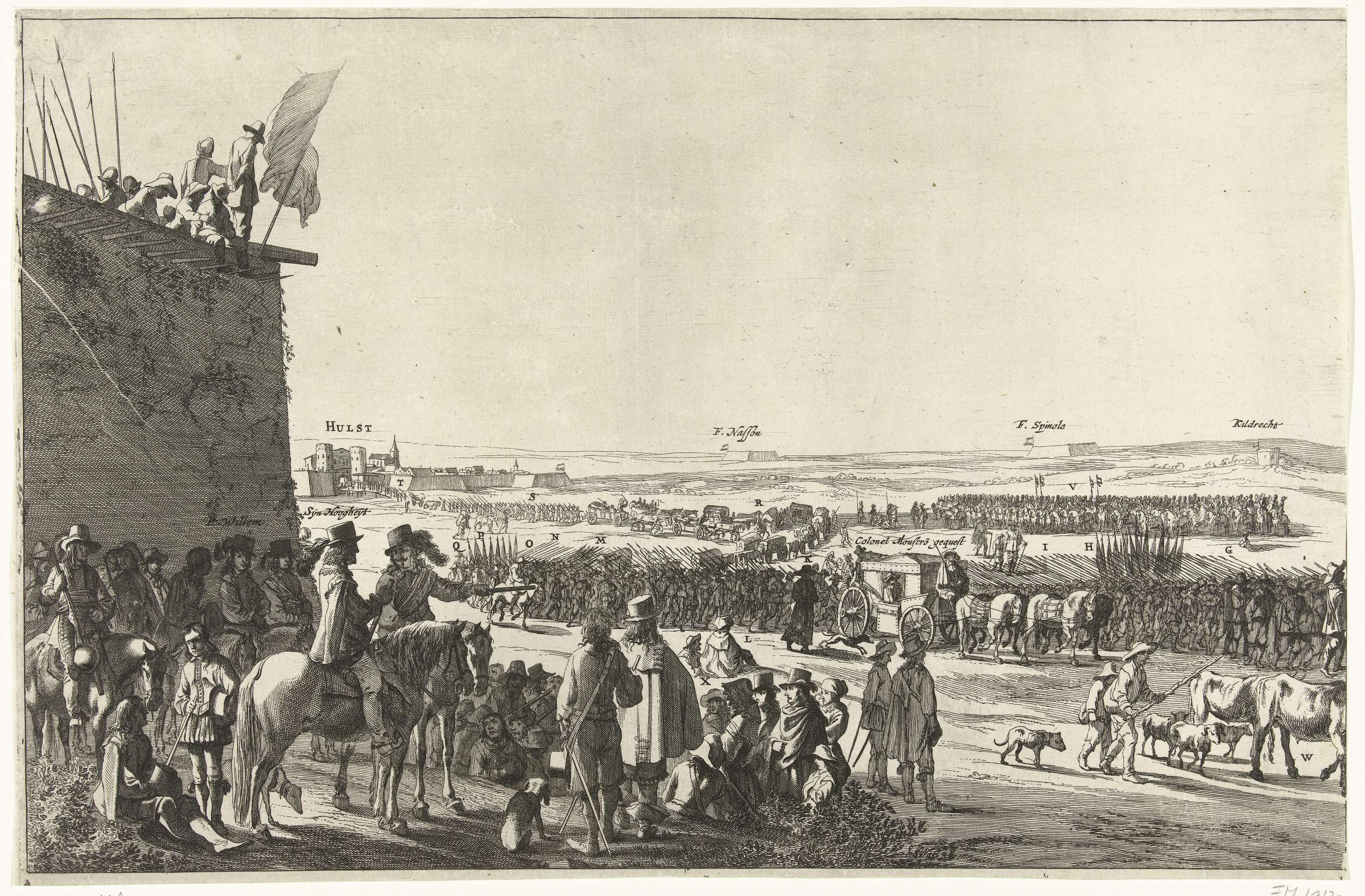 Uittocht van het Spaanse garnizoen uit Hulst (linkerblad), 1645. Hulst, belegerd door het Staatse leger onder Frederik Hendrik vanaf 28 september en ingenomen op 5 november 1645. Linkerblad in een voorstelling bestaande uit twee bladen. Op de voorgrond links bij de stadswal Frederik Hendrik met zijn zoon prins Willem II die toezien op de vertrekkende ...