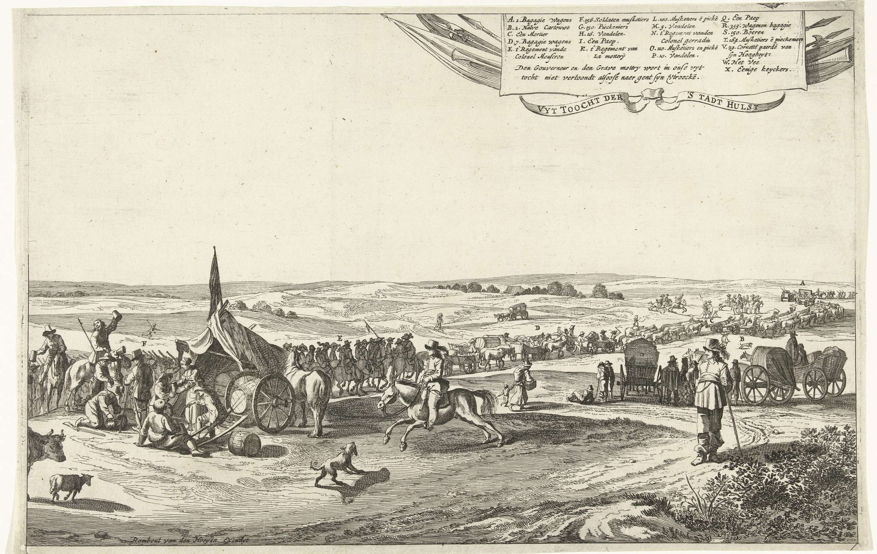 Uittocht van het Spaanse garnizoen uit Hulst (rechterblad), 1645. Hulst, belegerd door het Staatse leger onder Frederik Hendrik vanaf 28 september en ingenomen op 5 november 1645. Rechterblad in een voorstelling bestaande uit twee bladen. Op de voorgrond links drinkende soldaten bij een tent. In de stoet voetsoldaten, ruiters en goederenwagens. Bovenaan een cartouche met ...
