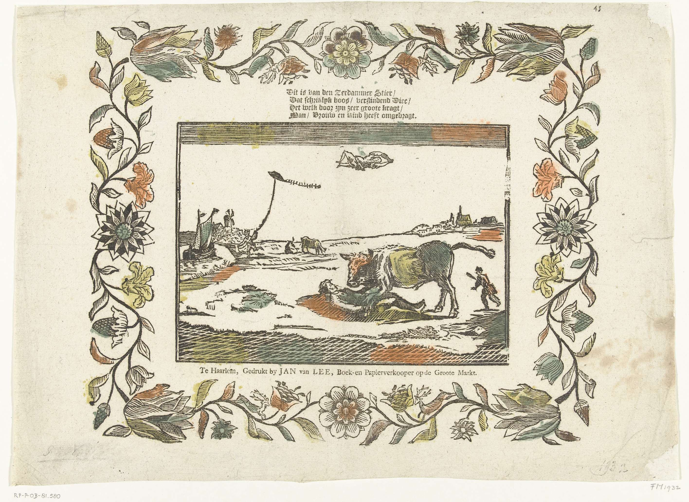 Illustratie van de gebeurtenissen die bekend staan als de wreedheid van de stier, 1647. De boer en zijn zwangere echtgenote die op 29 augustus 1647 te Zaandam door een stier werden aangevallen. De vrouw wordt door de stier op de horens genomen waarbij het kind uit de buik wordt geslingerd. Boven de voorstelling een versje ...