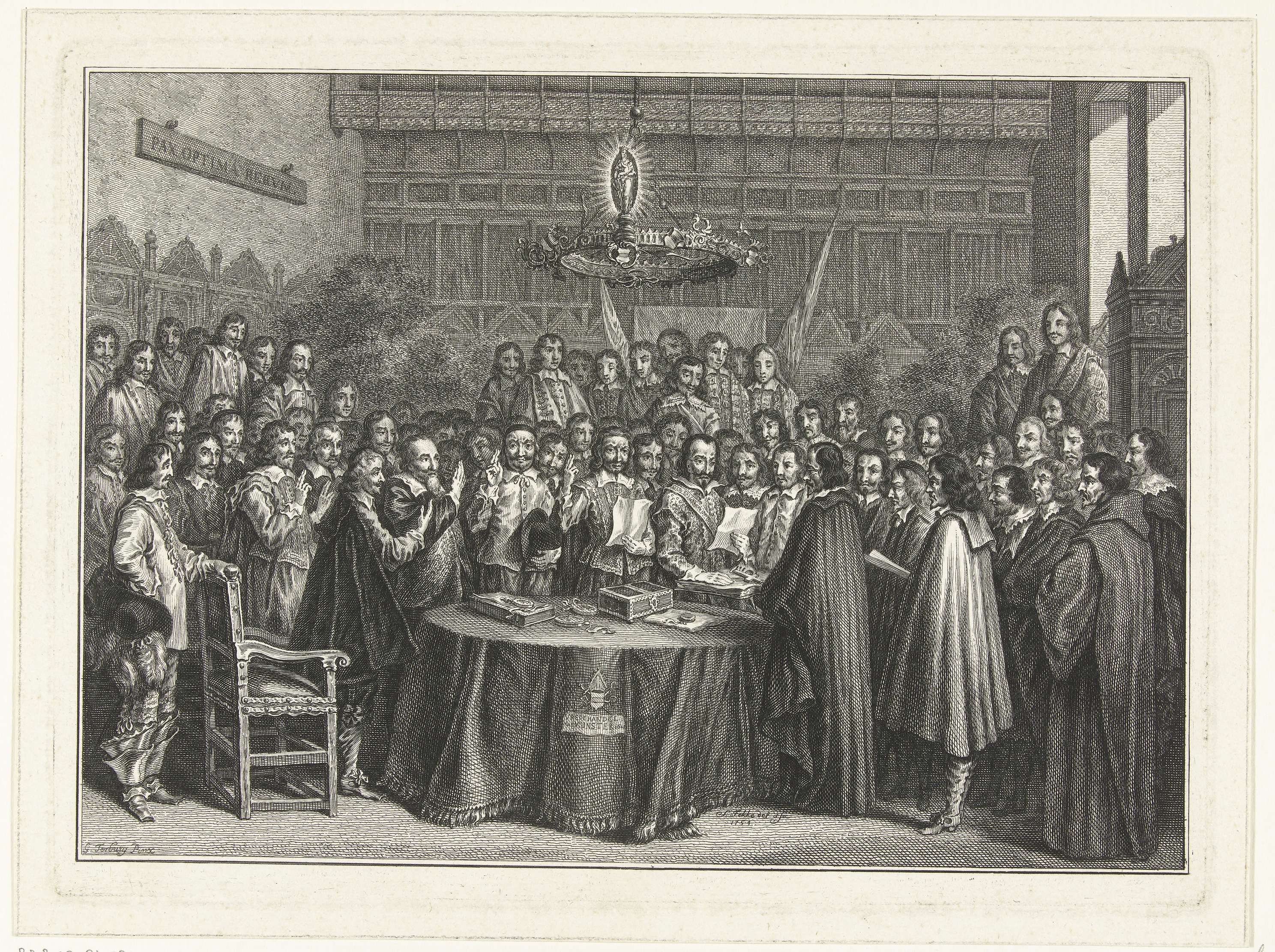 Het beëdigen van de Vrede van Munster op 15 mei 1648, in de grote zaal of Friedenssaal van het stadhuis te Munster. De afgevaardigden staan rond een tafel en leggen met opgestoken hand de eed af.