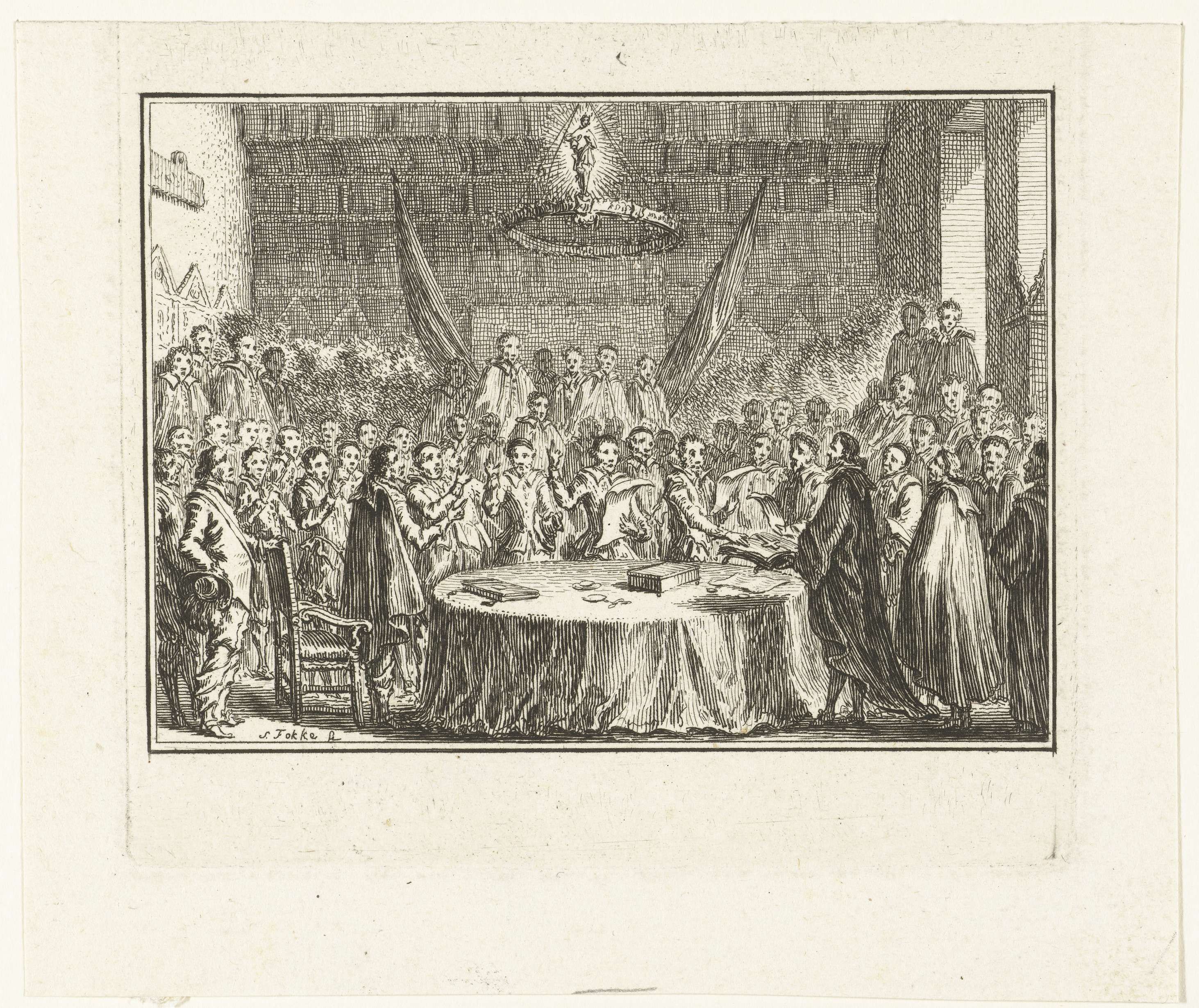 Het beëdigen van de Vrede van Munster op 15 mei 1648, in de grote zaal of Friedenssaal van het stadhuis te Munster. De afgevaardigden staan rond een tafel en leggen met opgestoken hand de eed af.