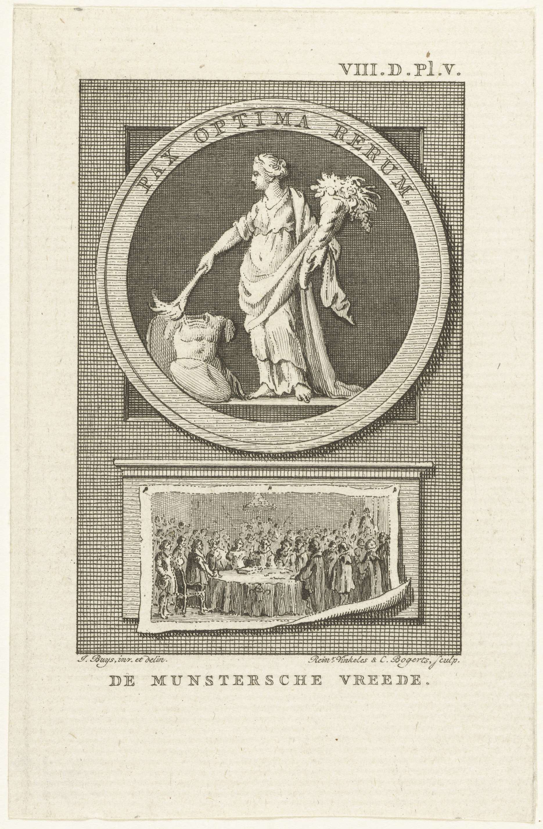 Allegorie op de Vrede van Munster, 1648. Embleem met Vrede die het vuur van de oorlog dooft. Daaronder een opgespijkerd papier met een voorstelling van het beëdigen van de Vrede van Munster op 15 mei 1648, in de grote zaal of Friedenssaal van het stadhuis te Munster.