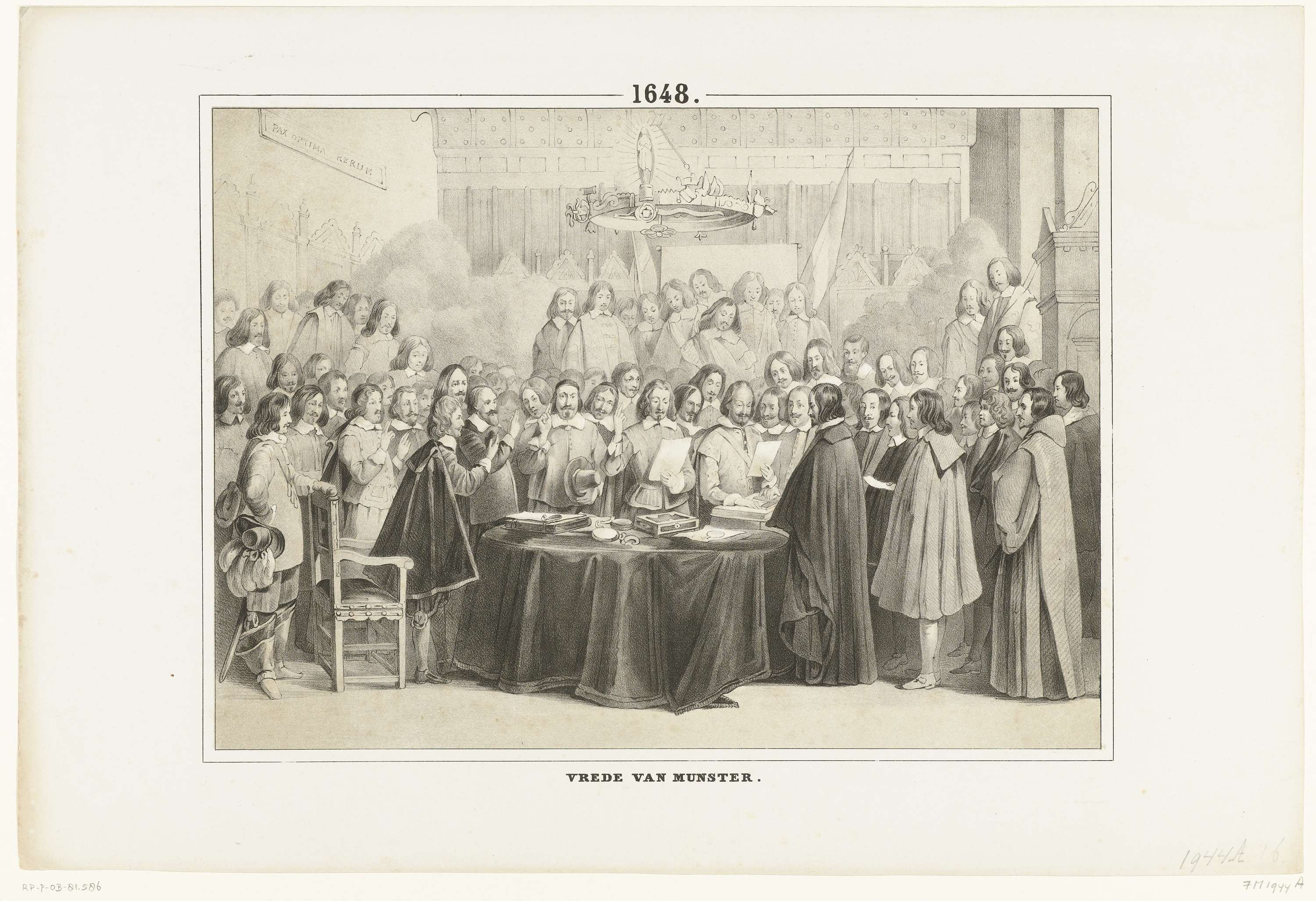 Het beëdigen van de Vrede van Munster op 15 mei 1648, in de grote zaal of Friedenssaal van het stadhuis te Munster. De afgevaardigden staan rond een tafel en leggen met opgestoken hand de eed af.
