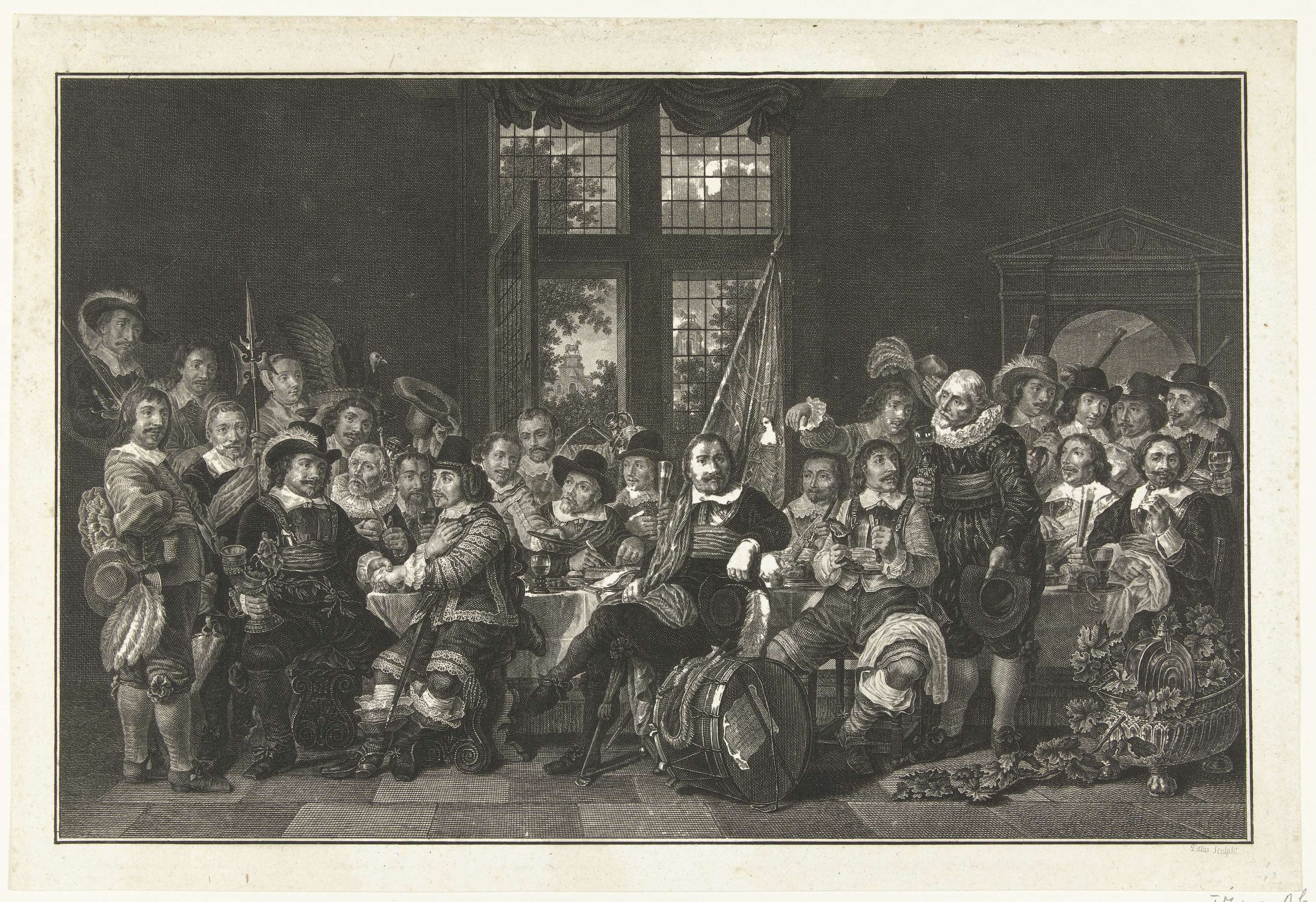 De schuttersmaaltijd in de Voetboogdoelen of St. Jorisdoelen te Amsterdam ter viering van het sluiten van de vrede van Munster, 18 juni 1648. Voorgesteld zijn: kapitein Cornelis Jansz Witsen (met de zilveren drinkhoorn), luitenant Johan Oetgens van Waveren (die zijn hand schudt), de vaandrig Jacob Banningh (zittend naast de grote trommel), Dirck Claesz Thoveling en ...