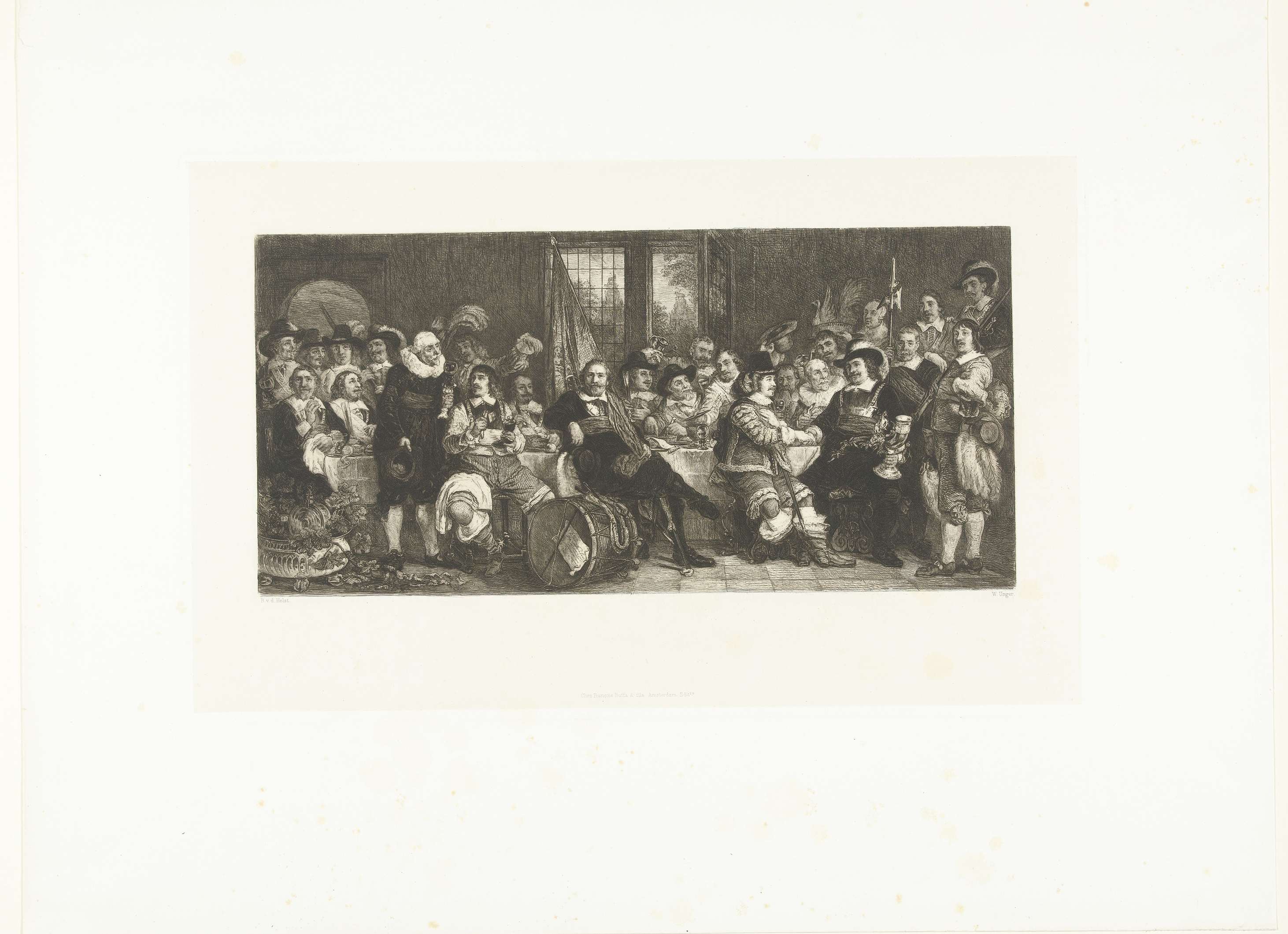 De schuttersmaaltijd in de Voetboogdoelen of St. Jorisdoelen te Amsterdam ter viering van het sluiten van de vrede van Munster, 18 juni 1648. Voorgesteld zijn: kapitein Cornelis Jansz Witsen (met de zilveren drinkhoorn), luitenant Johan Oetgens van Waveren (die zijn hand schudt), de vaandrig Jacob Banningh (zittend naast de grote trommel), Dirck Claesz Thoveling en ...