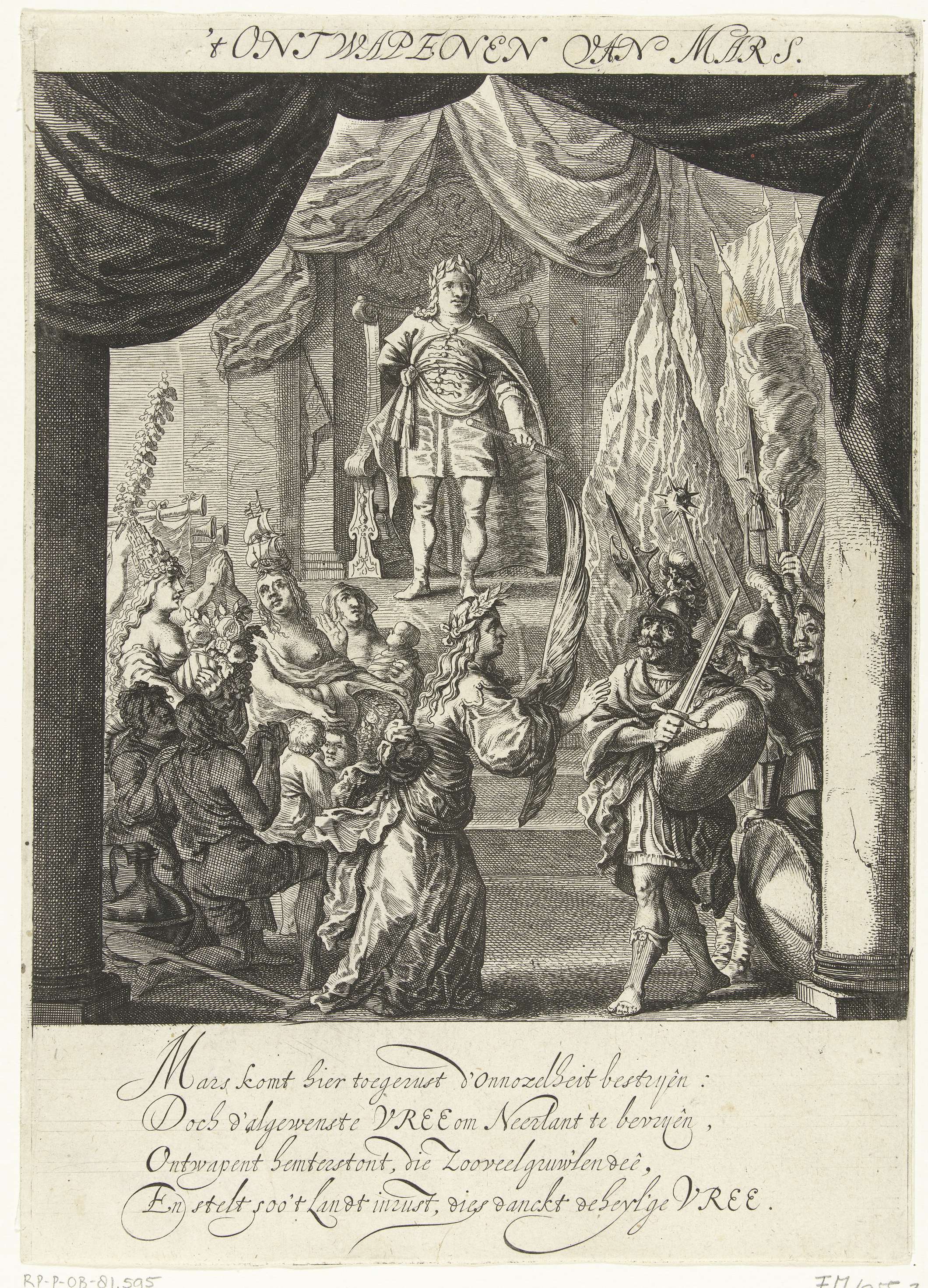 Vertoning van het Ontwapenen van Mars. Onderdeel van de vertoningen opgevoerd op 23 juni 1648 op de Schouwburg te Amsterdam naar aanleiding van het sluiten van de Vrede van Munster. De derde voorstelling toont hoe Mars door de Vrede wordt ontwapend. Op de achtergrond kijkt een Hollandse vorst toe. In het onderschrift een vers van ...