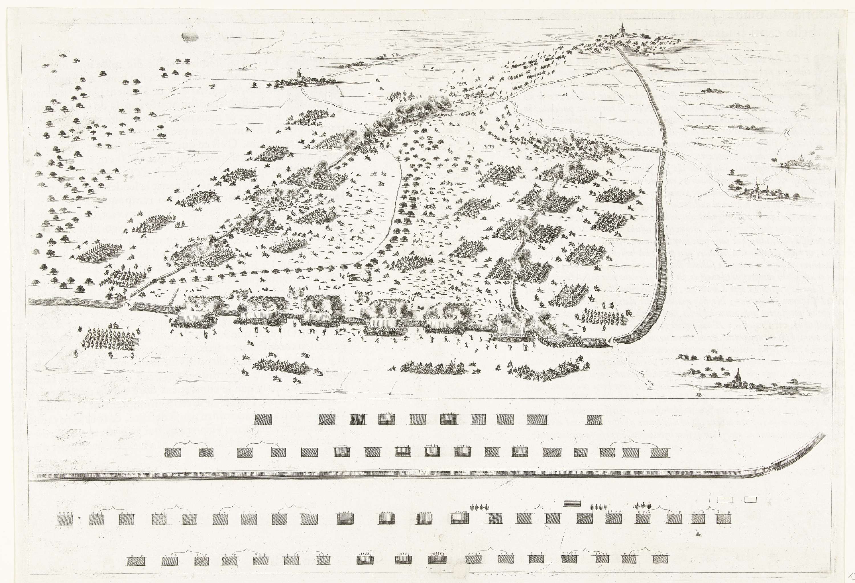 De veldslag bij Hickelsmey (bij Kempen), 17 januari 1642. Slag waarbij de Weimarse en Franse troepen onder Jean Baptiste Budes de Guébriant de overwinning behaalde over de keizerlijke Hessische troepen onder Guillaume de Lamboy. De veldslag vond plaats in Duitsland nabij Krefeld, Willich, Kempen. Boven een gezicht op de veldslag in vogelperspectief, onder de slagordes ...