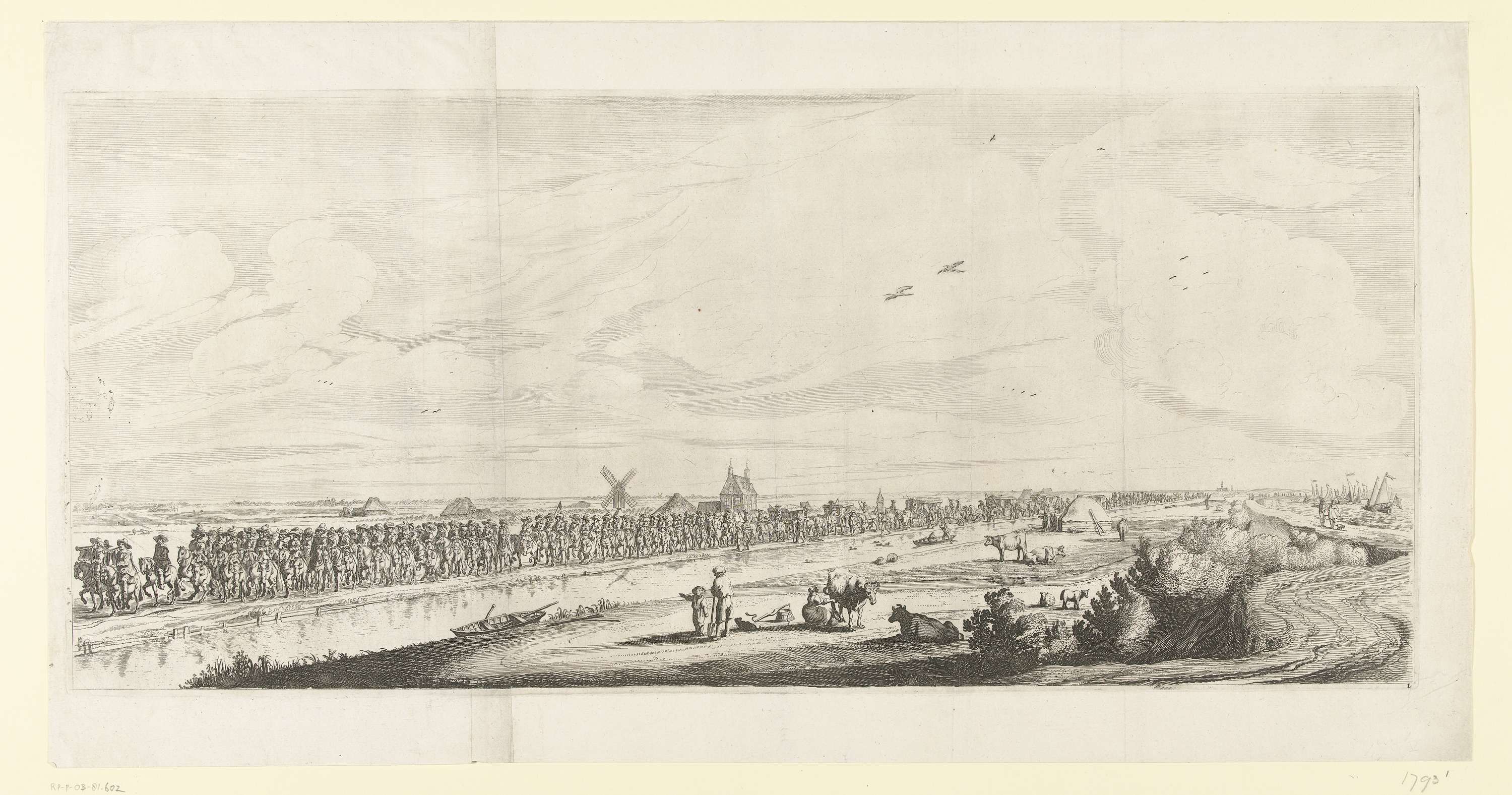 Optocht van de stoet met Maria de Médicis langs de Haarlemmerweg. De rijtuigen van de koningin begeleid door de Amsterdamse schutterij. Rechts bootjes op het IJ. Plaat nr. 1 in de illustraties in de beschrijving van de feestelijkheden bij het bezoek van Maria de Médicis aan Amsterdam, 31 augustus - 5 september 1638.