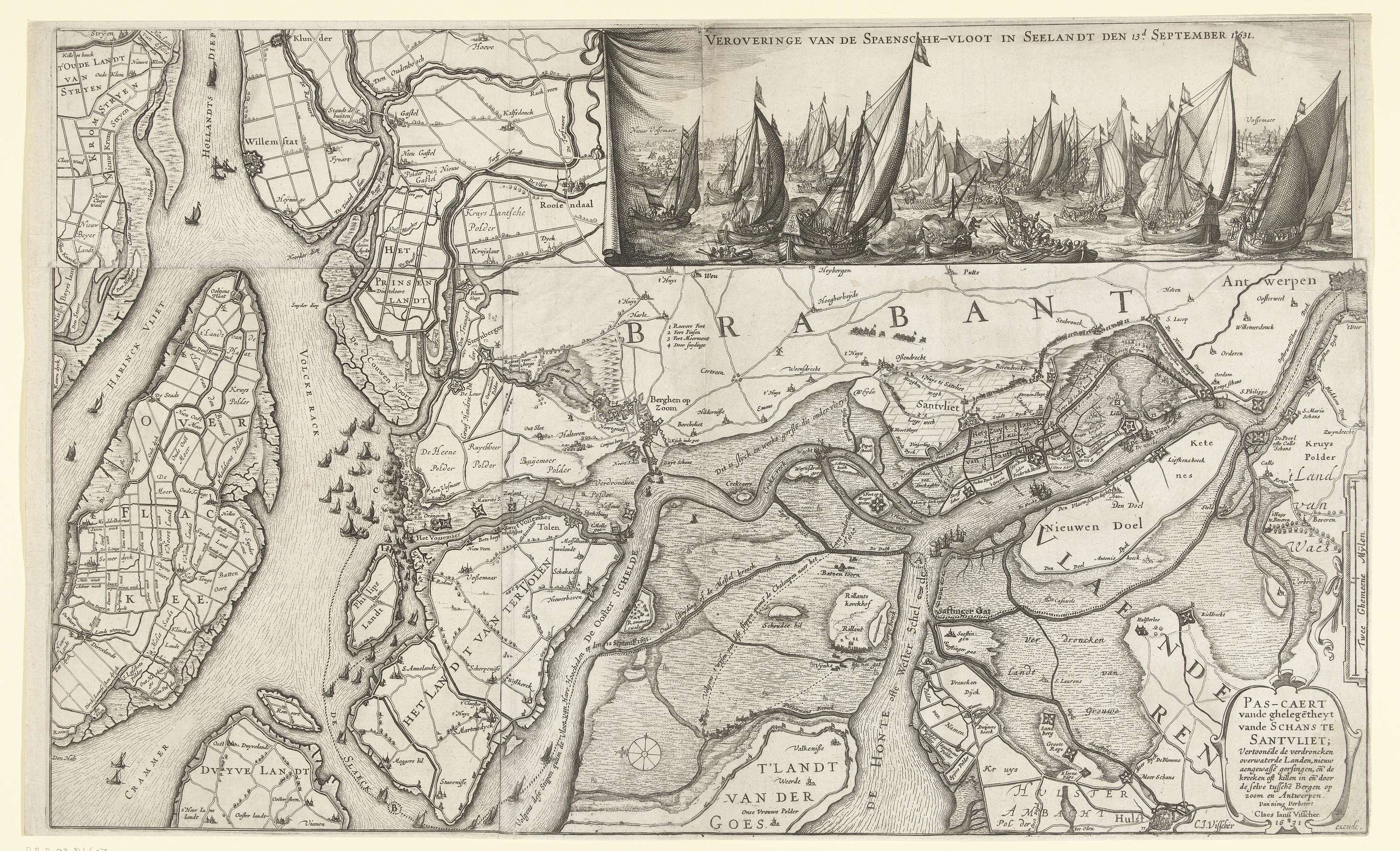 Kaart van de waterwegen, kreken en ondergelopen land tussen Bergen op Zoom, Zandvliet en Antwerpen. Op de kaart zijn de vaarroutes aangegeven die de Staatse en Spaanse vloten namen voor de slag op het Slaak. Rechtsboven een inzet met een voorstelling van de slag op het Slaak, 12-13 september 1631.
