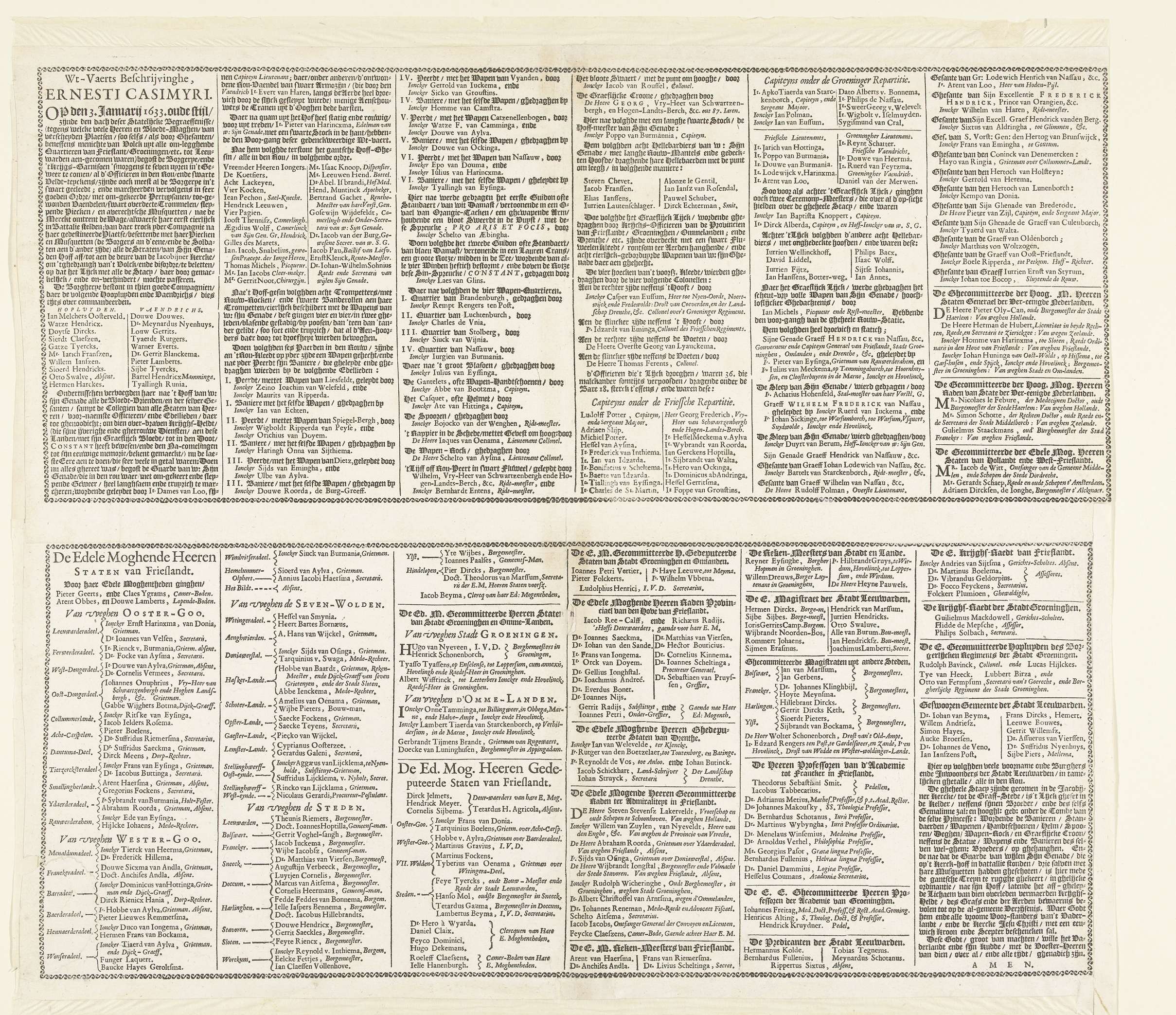 Tekstblad met een beschrijving van de volgorde van de deelnemers aan de begrafenisstoet, behorend bij de prentserie van de begrafenis van Ernst Casimir, graaf van Nassau-Dietz te Leeuwarden, 3 januari 1633. Twee bladen aan elkaar geplakt. Bestemd om afzonderlijk onder de prenten geplakt te worden.