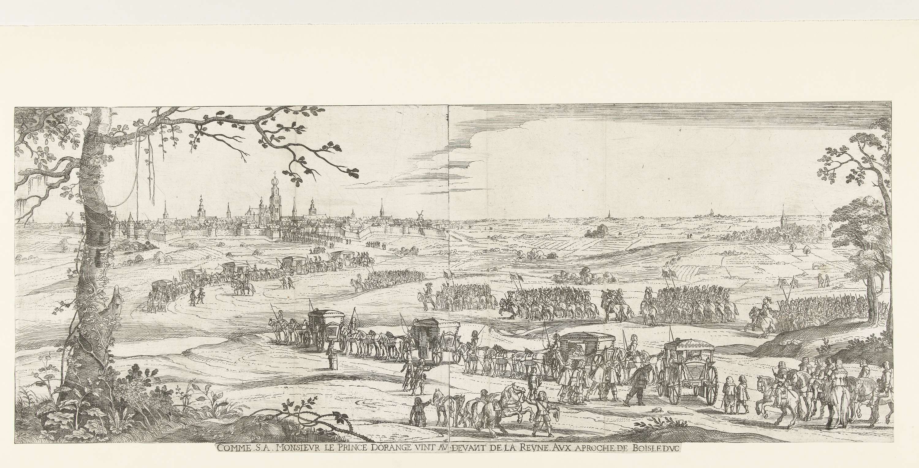 Stadhouder Frederik Hendrik komt de Franse koningin Maria de Médicis tegemoet, buiten 's-Hertogenbosch, augustus 1638. Landschap met de twee gezelschappen met wagens en soldaten, in de verte het profiel van Den Bosch. Twee bladen aan elkaar geplakt.