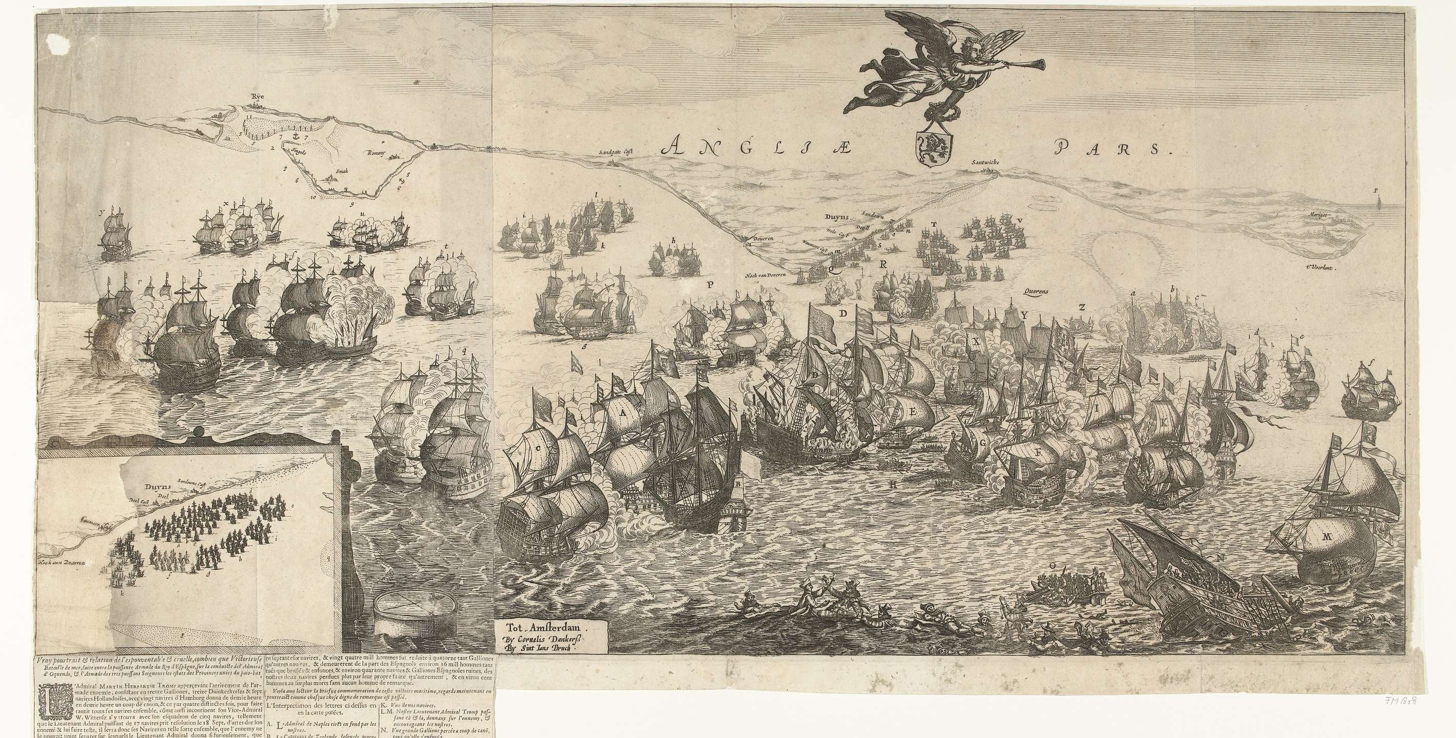 De zeeslag bij Duins voor de Engelse kust tussen de Staatse vloot onder Maarten Tromp en de Spaanse vloot onder bevel van Antonio de Oquendo, 21 oktober 1639. Op de voorgrond Spaanse drenkelingen in het water, op de achtergrond de Engelse kust. In de lucht de Faam met het wapen van de verenigde provincies. Linksonder ...