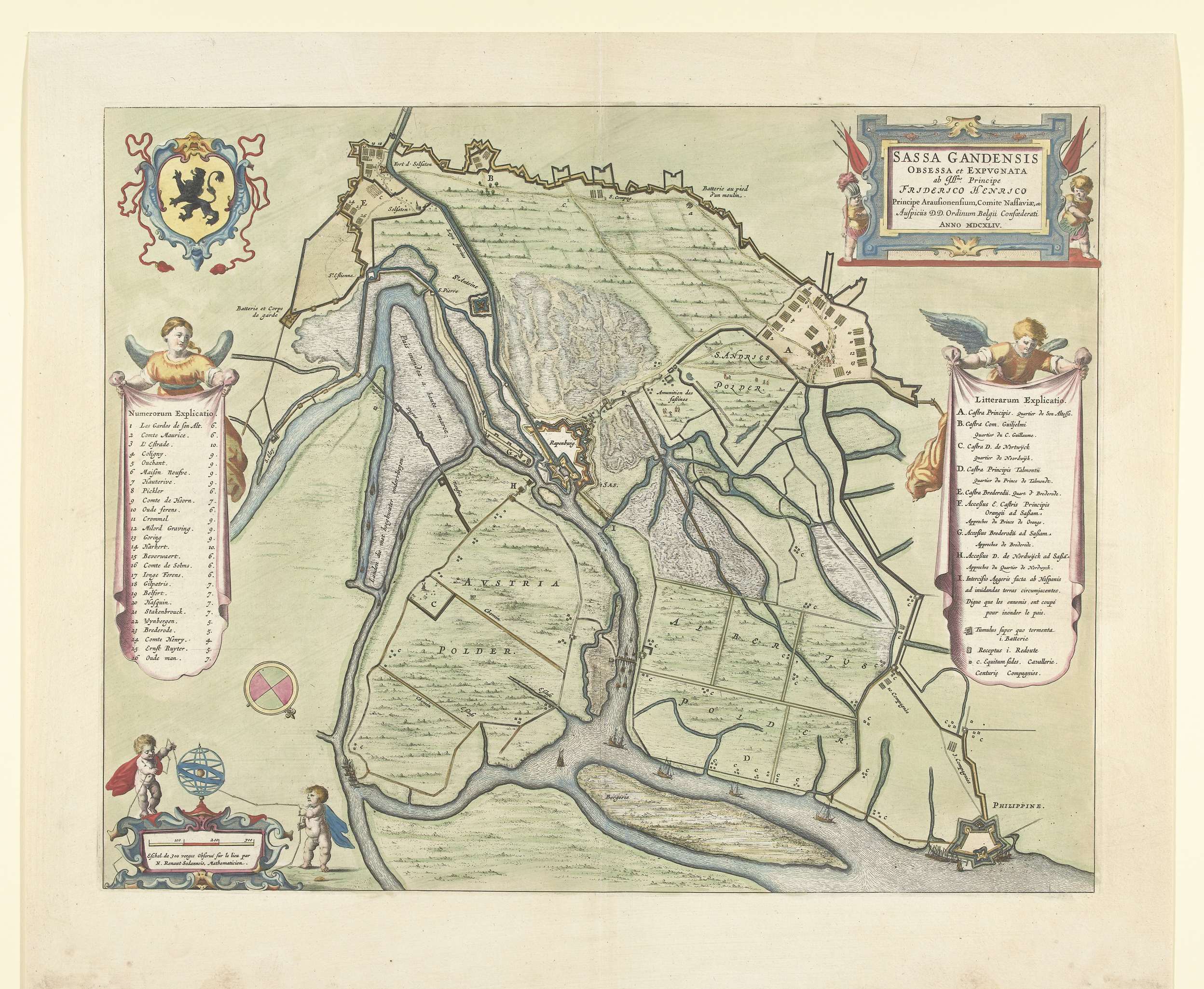 Kaart van het beleg van de stad Sas-van Gent door het Staatse leger onder Frederik Hendrik, begonnen 28 juli en ingenomen op 5 september 1644. Kaart van Sas-van-Gent en het omliggende land met de dijken en schansen aangelegd door de belegeraars en hun legerkampen. Links cartouches met het wapen, een engel met de legenda 1-26 ...