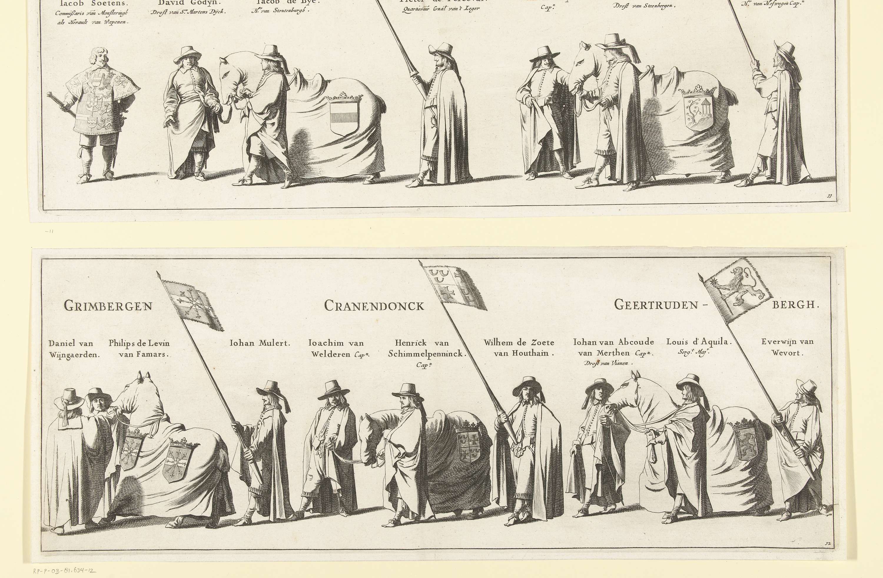 De begrafenisstoet van stadhouder Frederik Hendrik te 's-Gravenhage op 10 mei 1647. Plaat nr. 12 met een deel van de stoet met vaandeldragers en drie paarden, boven de personen staan hun naam en functie. Onderdeel van een serie van 30 platen en 20 tekstbladen, bedoeld om aan elkaar geplakt te worden.