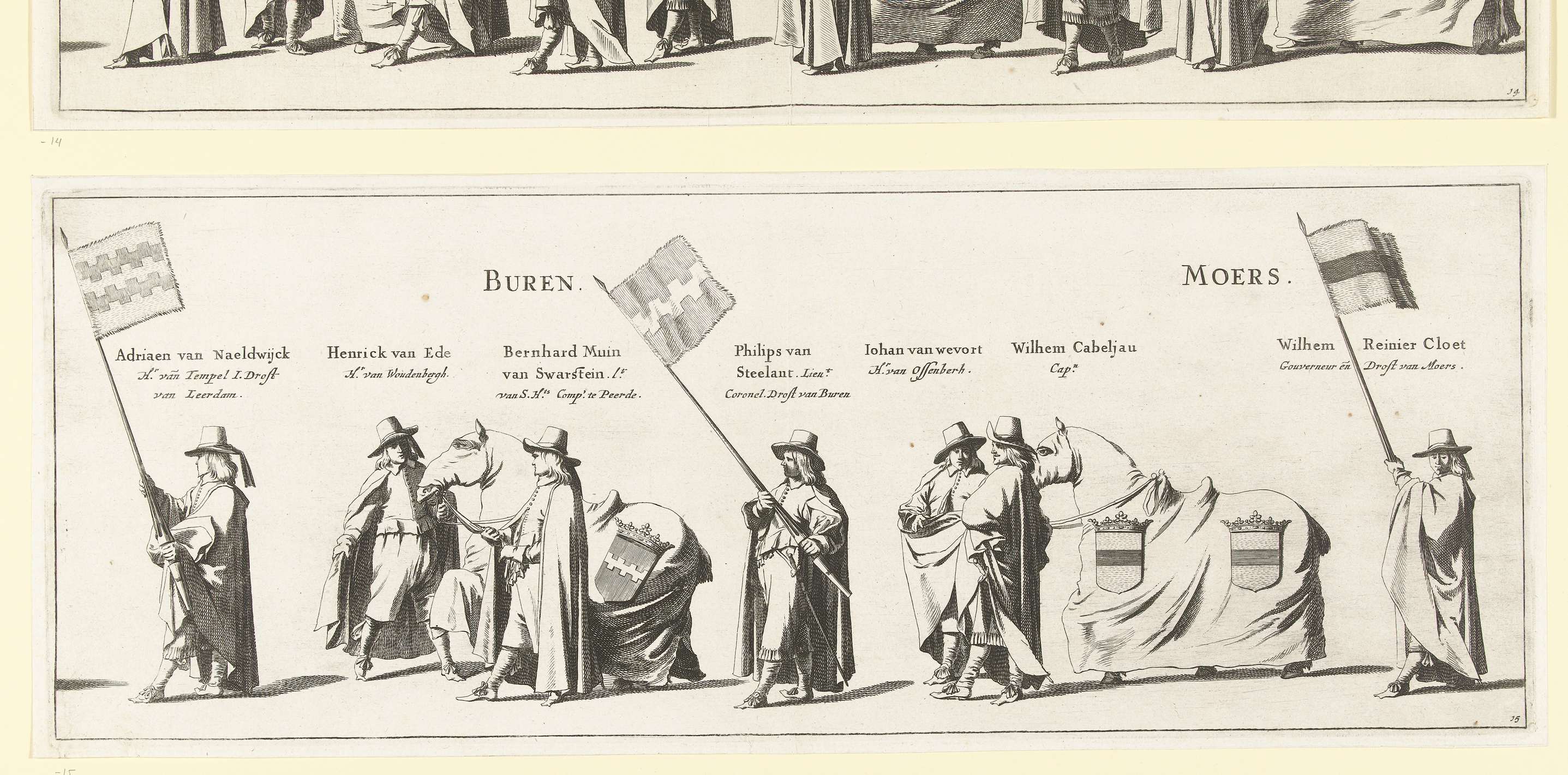 De begrafenisstoet van stadhouder Frederik Hendrik te 's-Gravenhage op 10 mei 1647. Plaat nr. 15 met een deel van de stoet met vaandeldragers en twee paarden, boven de personen staan hun naam en functie. Onderdeel van een serie van 30 platen en 20 tekstbladen, bedoeld om aan elkaar geplakt te worden.