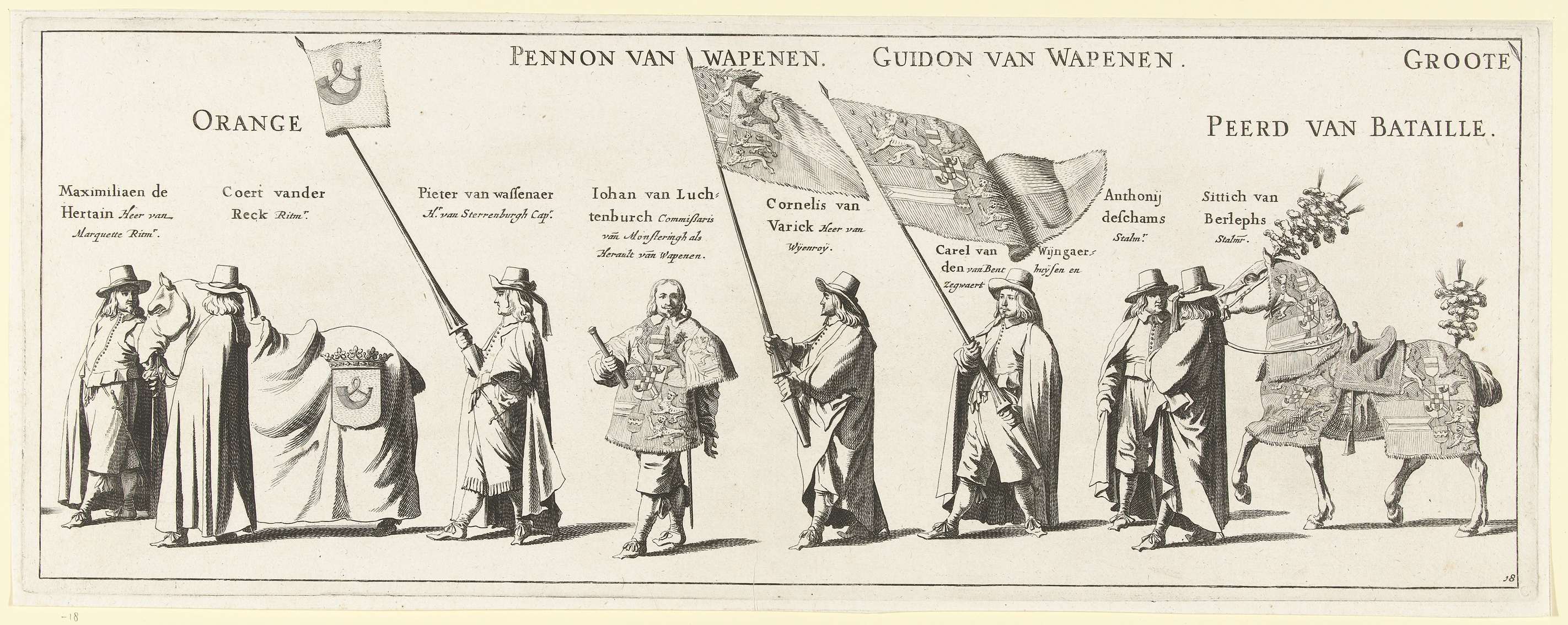 De begrafenisstoet van stadhouder Frederik Hendrik te 's-Gravenhage op 10 mei 1647. Plaat nr. 18 met een deel van de stoet met vaandeldragers en twee paarden, boven de personen staan hun naam en functie. Onderdeel van een serie van 30 platen en 20 tekstbladen, bedoeld om aan elkaar geplakt te worden.