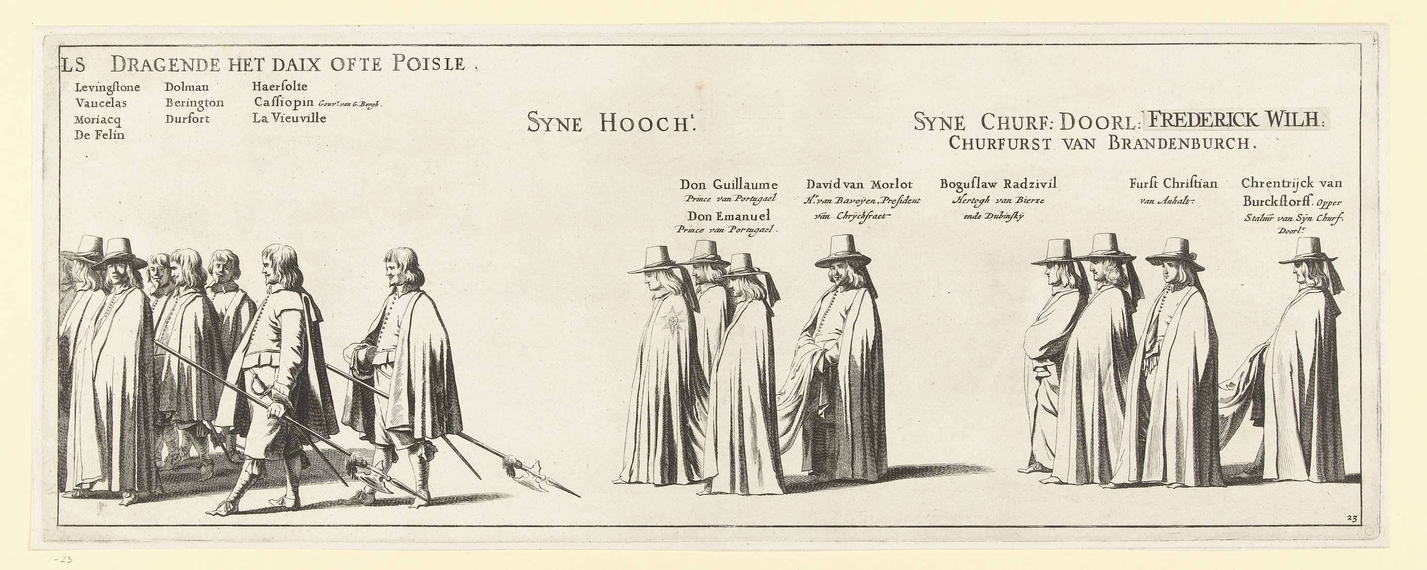 De begrafenisstoet van stadhouder Frederik Hendrik te 's-Gravenhage op 10 mei 1647. Plaat nr. 23 met een deel van de stoet, boven de personen staan hun naam en functie. Een strookje met de naam Frederick Wilh. opgeplakt. Onderdeel van een serie van 30 platen en 20 tekstbladen, bedoeld om aan elkaar geplakt te worden.