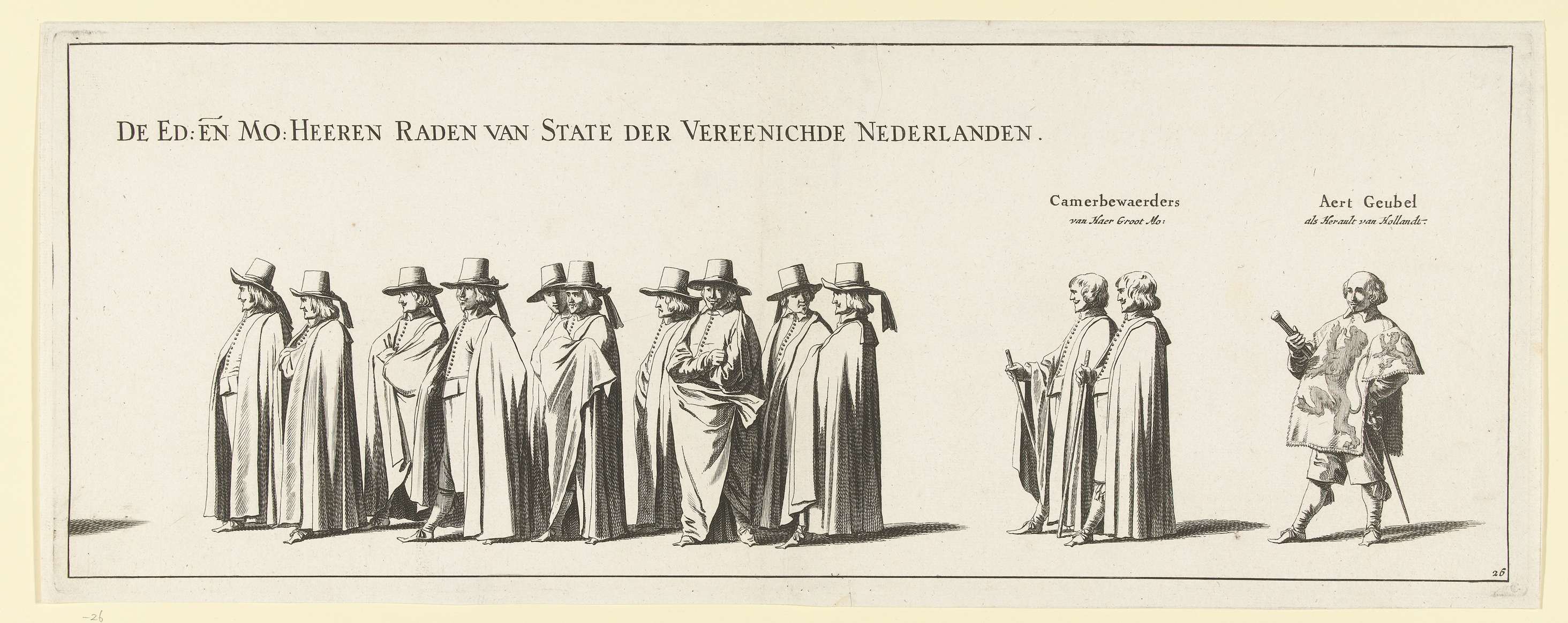 De begrafenisstoet van stadhouder Frederik Hendrik te 's-Gravenhage op 10 mei 1647. Plaat nr. 26 met een deel van de stoet met leden van de Staten-Generaal, boven de personen staat hun functie. Onderdeel van een serie van 30 platen en 20 tekstbladen, bedoeld om aan elkaar geplakt te worden.